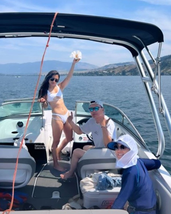 熱愛戶外活動的一家人,近日坐遊艇出海。苗彤換上白色比基尼,大曬腹肌,看來練習打拳有功,身形Fit爆。苗俊則玩衝浪,兩名子女都遺傳了爸爸的運動基因,活潑好動。而媽媽戚美珍則陪伴左右,她戴上防曬帽和白色頭套,穿上密實的泳衣,顯得怕曬,但依然笑容燦爛,與家人享受美好時光。