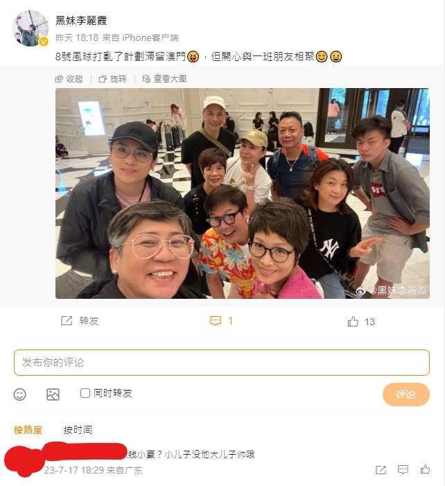 錢小豪丘倩鳴同黑妹等一班好友遊澳門。(黑妹李麗霞微博)