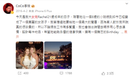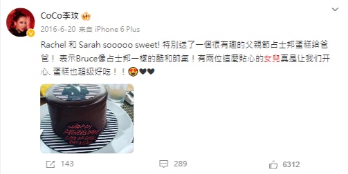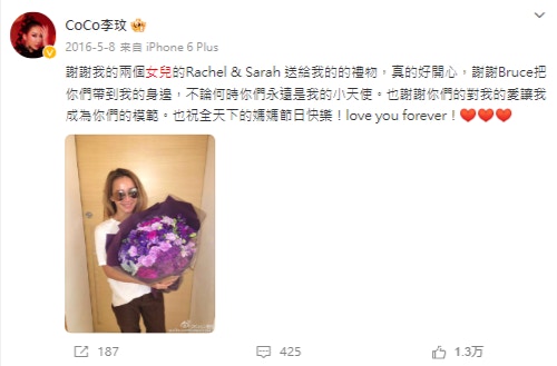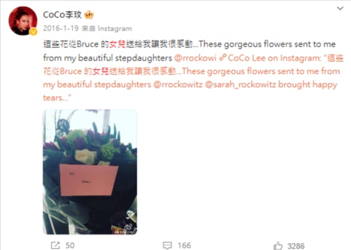 天后李玟(CoCo)日前離世,終年48歲。李玟2011年和加拿大籍富商老公Bruce(樂裕民)於結婚,婚後撫養老公和前妻生下的2名繼女,李玟一直將老公與前夫的兩個女兒視如己出,經常在社交平台分享和2名繼女的合照,母女感情看來相當好,最後一條提到女兒的微博是在2017年母親節,李玟指收到兩位女兒送上的一大束花,非常開心。然而後來傳出Bruce遭爆婚內多次出軌,李玟向視如己出的繼女吐苦水卻未獲支持,讓她身心俱疲。