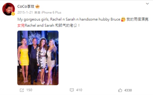 天后李玟(CoCo)日前離世,終年48歲。李玟2011年和加拿大籍富商老公Bruce(樂裕民)於結婚,婚後撫養老公和前妻生下的2名繼女,李玟一直將老公與前夫的兩個女兒視如己出,經常在社交平台分享和2名繼女的合照,母女感情看來相當好,最後一條提到女兒的微博是在2017年母親節,李玟指收到兩位女兒送上的一大束花,非常開心。然而後來傳出Bruce遭爆婚內多次出軌,李玟向視如己出的繼女吐苦水卻未獲支持,讓她身心俱疲。