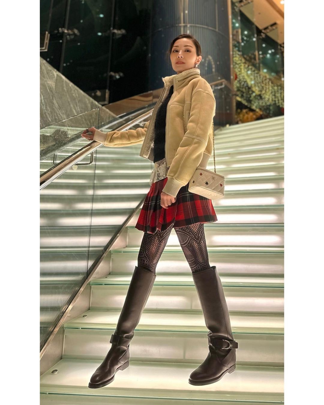 身穿紅色格仔裙,卻搭配豹紋褲襪。(IG@michele_monique_reis)