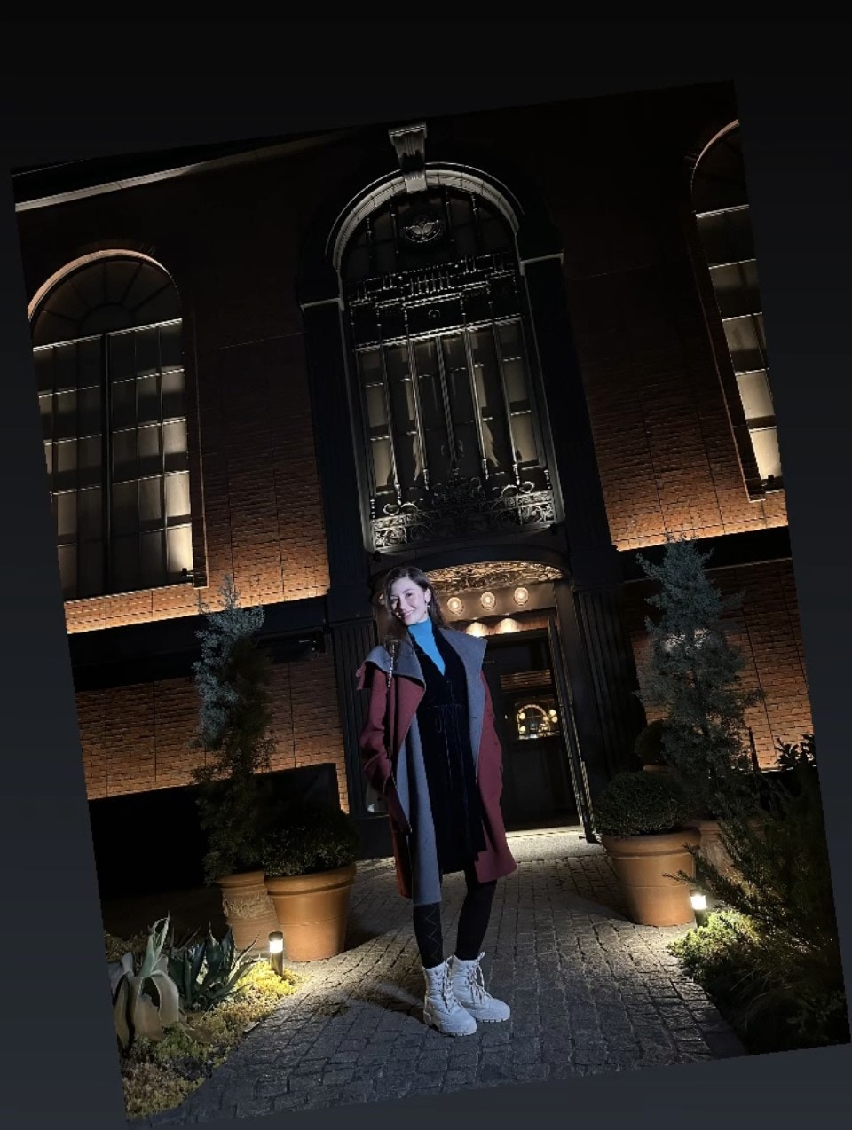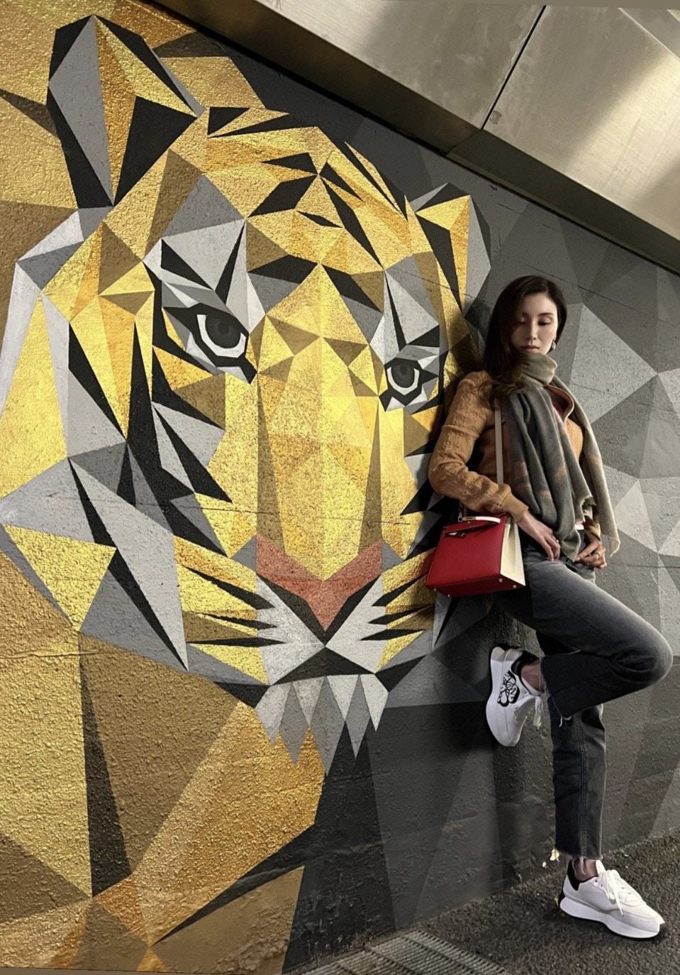 身穿黑色設計款西裝襯灰色百褶短裙的Michele,配上波點絲襪、黑色短靴,拎住橙紅色HERMÈS Kelly手袋,貴氣十足。(IG@michele_monique_reis)