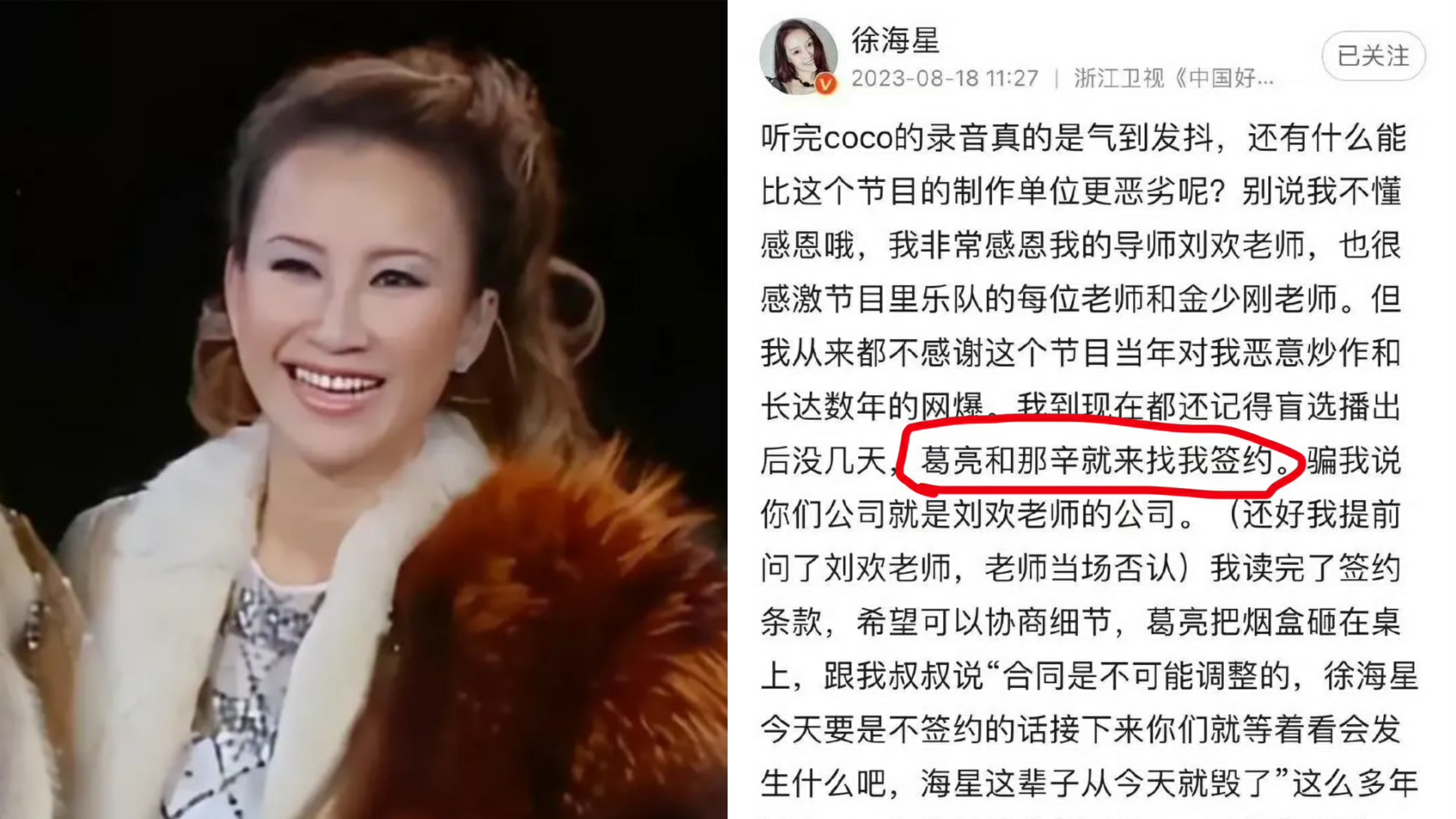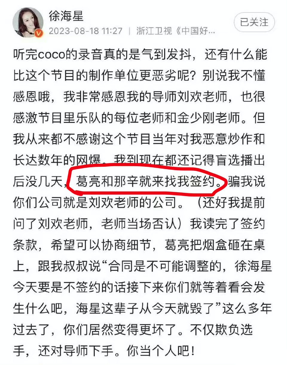 已故天后李玟(Coco)近日被爆出,一段控訴內地歌唱選秀真人騷《中國好聲音》賽制不公的錄音,隨住Coco離世,該節目陸續被爆出更多黑材料。參賽者李嘉捷、王澤鵬、周菲戈先後爆出節目安排不公以及疑黑箱作業。Coco好友甄妮亦留言轟節目組欠缺良知。首屆學員徐海星發文近日發文,控訴曾遭節目藝人總監葛亮、以及內地天后那英家姐那辛哄騙簽下不公平合約,並恐嚇她如不簽約,星途便會玩完。之後那辛發文反擊,否認迫人簽約,「完全不認識的人編出一個我逼她簽約的劇情,想象力豐富。」又否認自己為節目引進公司燦星文化老闆。點擊睇徐海星和那辛發文:首屆參賽者徐海星爆料指節目迫她簽不平等合約。(微博) 那辛發文否認。(微博)