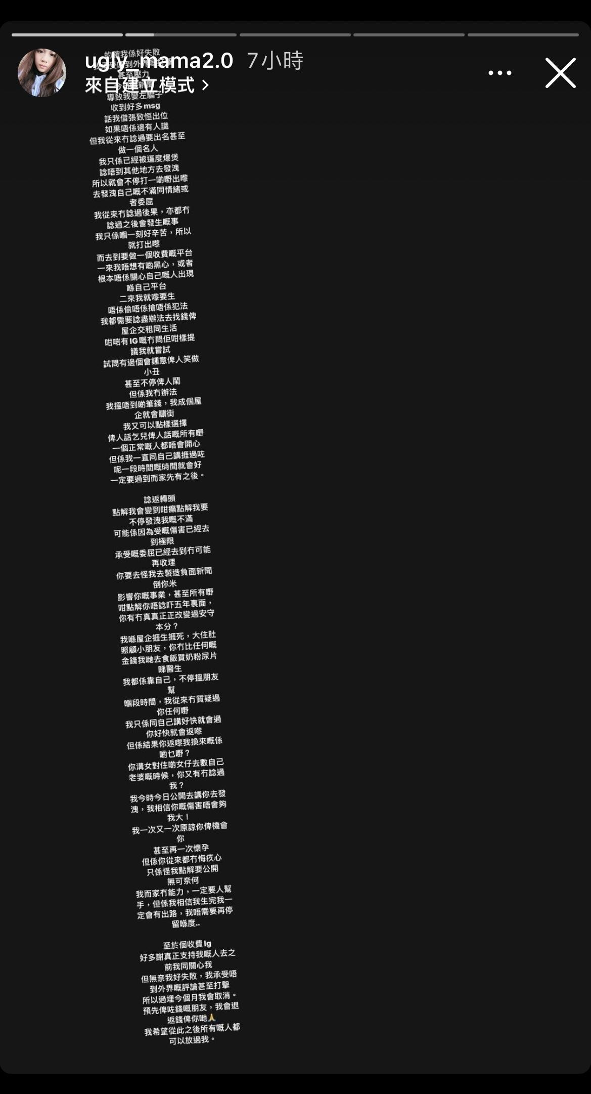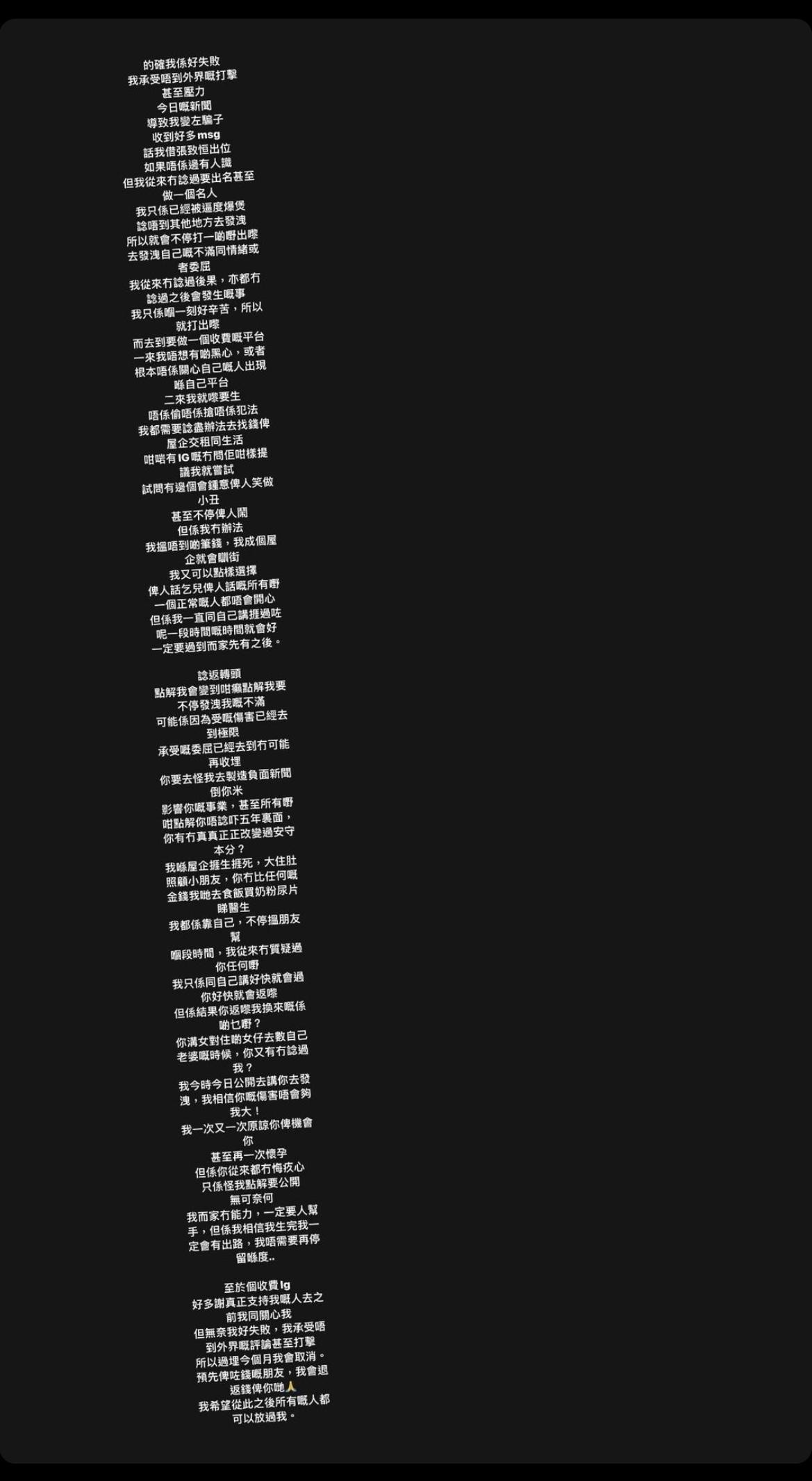 雯雯寫道:「的確我係好失敗 我承受唔到外界嘅打擊 甚至壓力 今日嘅新聞導致我變咗騙子 收到好多msg 話我借張致恒出位 如果唔係邊有人識 但我從來冇諗過要出名甚至做一個名人 我只係已經被逼到爆煲 諗唔到其他地方去發洩 所以就會不停打一啲嘢出嚟 去發洩自己嘅不滿同情緒或者委屈」