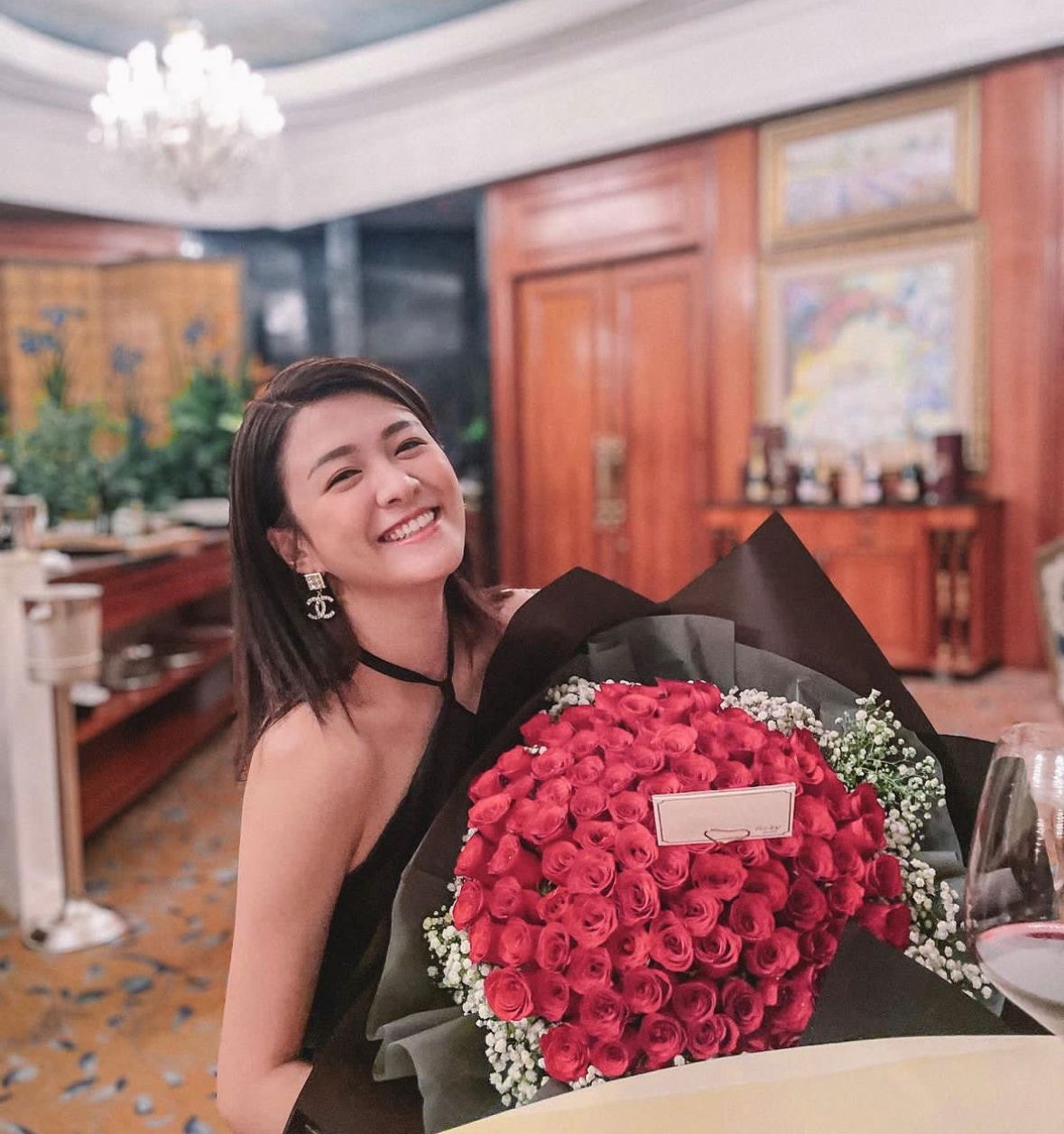 江嘉敏早前在社交平台捧住一大束玫瑰放閃。(IG:kaman_kong)