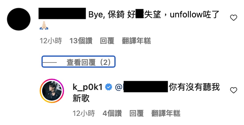 有網民就覺得,兩年前Gigi剛出道,不認識她也很正常;但卻也有人覺得保錡擦鞋搏上位,而留言區亦掀起了一片罵戰。儘管兩台歌手互相表達欣賞之情,但粉絲卻似乎水火不容,有人稱:「Bye, 保錡 好X失望,unfollow咗了🙏🏻」、「你咩料呀,同佢合照,我真係對你好失望😓😓」、「我明大佬你對同行都會有份尊重。不過都請你考慮吓兩邊fans嘅感受」等,相信保錡都始料不及,但亦有高EQ回覆部分人說:「你有沒有聽我的新歌?」、「感謝您憎我咁耐都留意我」不過,捱鬧的保錡亦吸引了一班Gi炎粉留言表達支持。