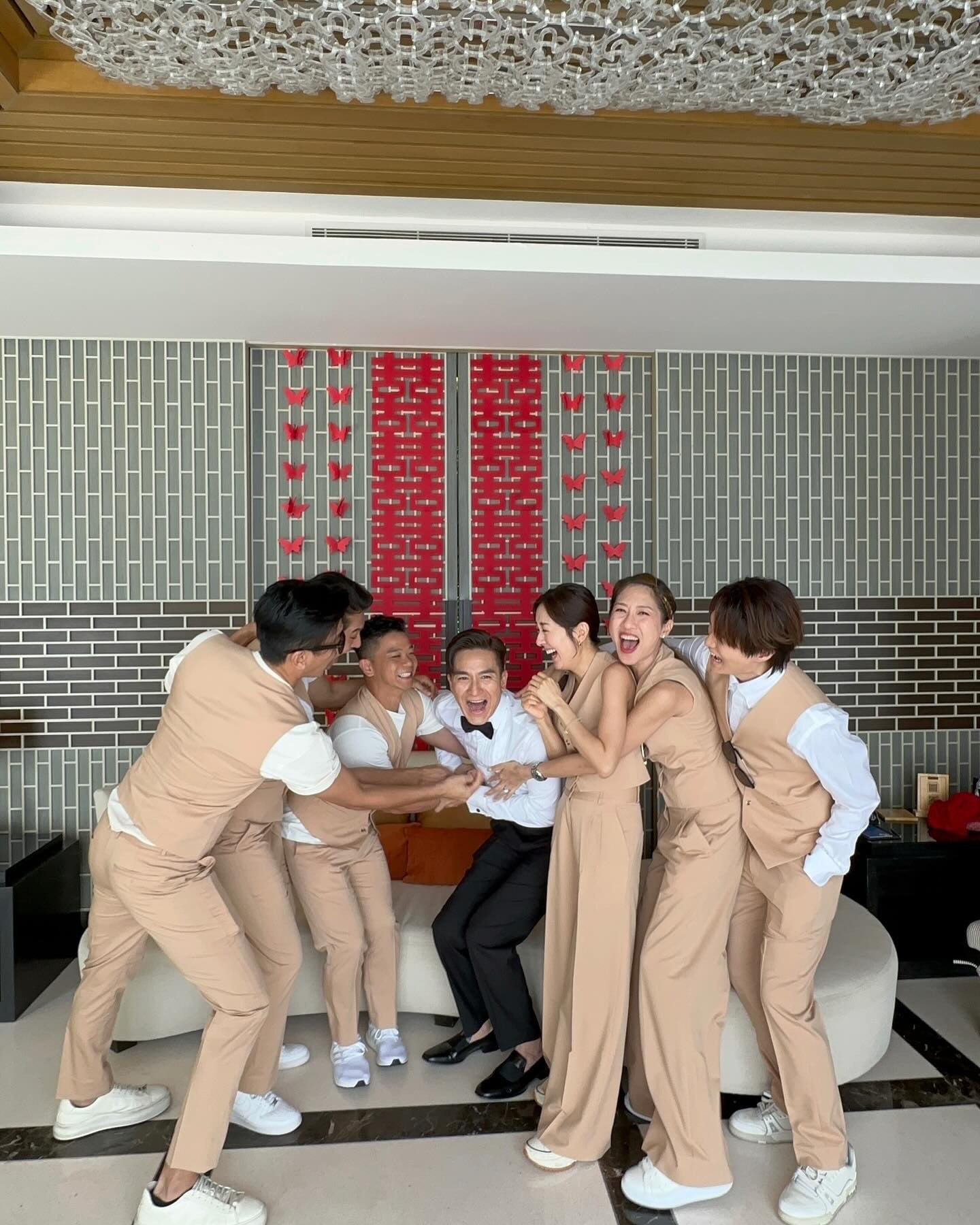 從Natalie上貼的花絮照可見,一班兄弟團包括林子善、陳敏之、黎諾懿等,他們均統一身穿淺玫瑰金色的兄弟團服上陣,大家圍着新郎哥馬國明笑得燦爛,氣氛相當好。