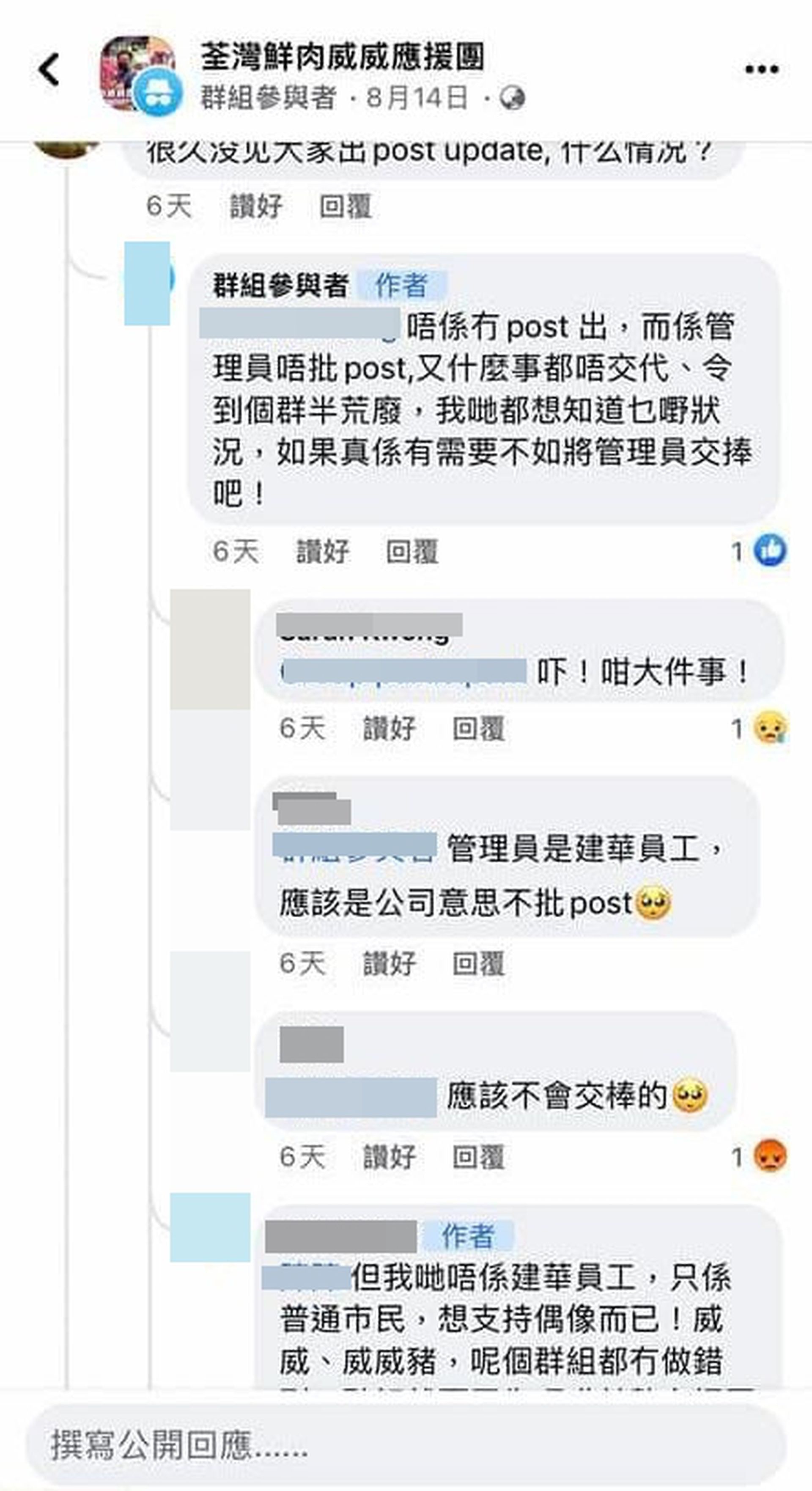 9月,有網民發現一向非常熱鬧的Facebook群組「荃灣鮮肉威威應援團」(威威粉絲團)突然冇晒聲氣,進入群中查看才發現群組在8月15日起就沒有更新任何帖文,群組停運令到不少網民都質疑威威是否因早前過多負面新聞被雪藏,令明星之路僅維持短短57日就此完結。(網上圖片)