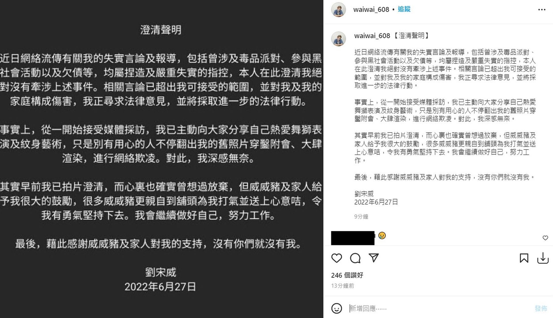 6月16日,威威在社交平台上載了一段短片,表示自己受到網絡欺凌,威威面對連日來的負評壓力終於忍不住出聲。威威說自己終於明白到人紅是非多這個道理,並話:「我只係一個普通屋邨成長,基層出身,亦唔係大家所講的黑社會,請大家唔好標籤有紋身的人,係屋邨長大就係黑社會?」(網上圖片)