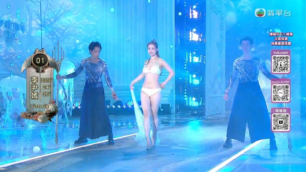 今年泳裝環節由阮兆祥負責擔大旗,大搞爛Gag。第一位出場是(1)李尹嫣,阮兆祥問她在以下三個選項哪一條法例是真:1、佛羅里達州旁晚6點後不准放屁;2、米蘭以前有條法例禁止人黑臉;3、在日本中年人過肥是違法。李尹嫣選擇第三條,但其實三條都是真的,雖然答錯,但她回答淡定,表示如果要她揀選其中一條在香港實行,她都會揀第三條,希望每個人都身體健康,如果有這條法例,大家都可以長命百歲,獲得不少掌聲。