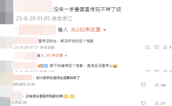 而一向是票房保證的吳京,是次新作失敗,引起不少網民議論紛紛,留言表示:「沒來一手愛國宣傳玩不轉了」、「估計演藝生涯要結束了」等,但另有網民則認為可能宣傳不足,才導致電影沒有產生宣傳效果。