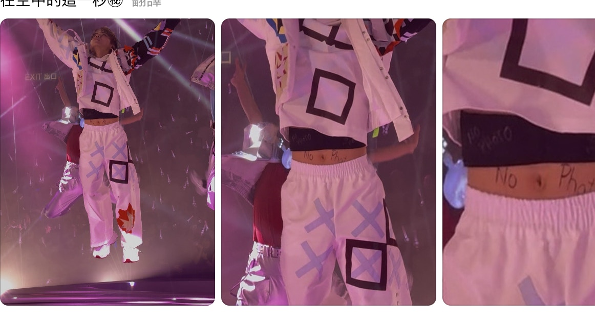 林家謙在演唱會又唱又跳,有人拍下林家謙跳起一刻,發現林家謙肚腩及打底黑衫都寫上「No Photo(請勿拍照)」7個英文字,似乎已一早預知跳起時會露出肚腩,非常逗趣。網民搞笑地以林家謙歌名形容「露腩」場面,「在空中的這一秒」。歌迷笑言:「底衫都寫埋你個細節控」。