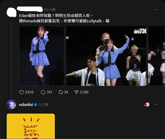 雖然小如豬首次演出獲得不少讚賞,但亦有網民批評:「Edan個妹有咩咁靚?明明生到成個男人咁。開threads睇到都尷尬死,仲要懶可愛跳Lollytalk,嘔。」愛妹心切的Edan亦馬上出現,回覆該名網民及貼上貼圖表示:「關你諗事。」