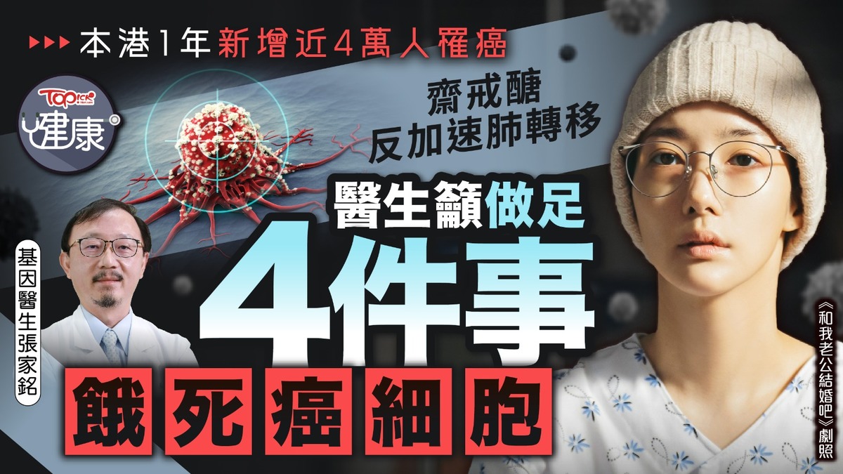 癌症/抗癌食物/癌細胞︱根據世界衛生組織2024年數據,2022年全球患癌新症數字約有2,000萬,當中死亡人數接近1,000萬。而香港癌症資料統計中心報告指出,2021年錄得的癌症新症有38,462宗,死亡個案則有15,108宗。台灣有醫生引述最新研究,指出僅低醣飲食難以全面抑制癌細胞,反而會增加癌症肺轉移的風險。要全方位防癌抗癌,就要做到以下4件事。