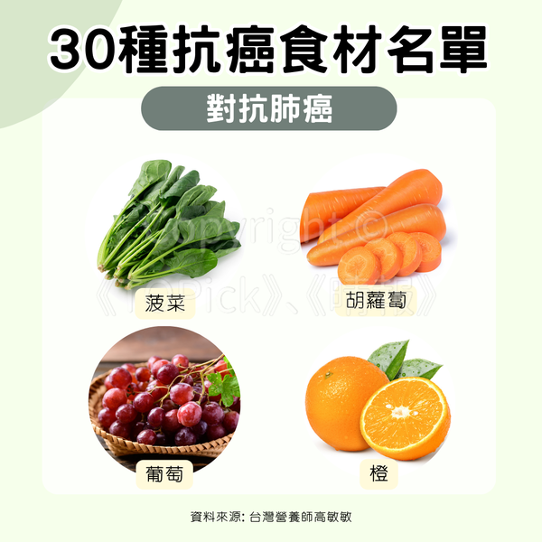 - 菠菜、胡蘿蔔、葡萄、橙(對抗肺癌)
