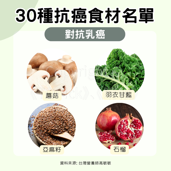 - 蘑菇、羽衣甘藍、石榴(對抗乳癌)