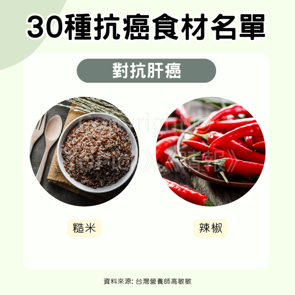 台灣營養師高敏敏在Instagram專頁發文,整理分享美國癌症基金會(American Cancer Society, ACS)公佈的30種抗癌食材名單。「預防勝於治療」,大家可以靠日常健康飲食對抗癌細胞,盡量選擇天然食材、減法烹調、彩虹飲食,吃出健康人生!