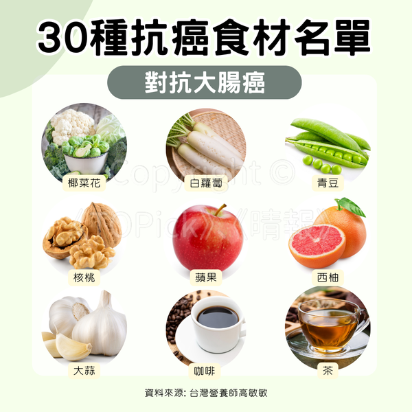 - 椰菜花、白蘿蔔、青豆、蘋果、葡萄柚(對抗大腸癌)