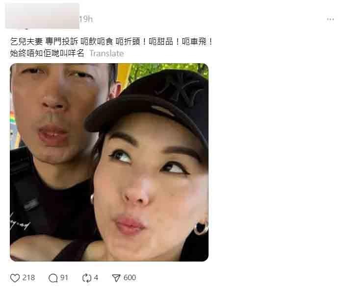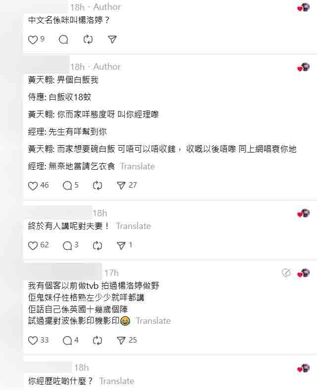 日前有網民在Threads上載楊洛婷同黃天翱的合照,並留言:「乞兒夫妻 專門投訴 呃飲呃食 呃折頭!呃甜品!呃車飛!始終唔知佢哋叫咩名。」其後該網民繼續留言:「佢老婆係咪真係參加過香港小姐?」、「好想知道個女乞兒叫咩名有冇人可以幫幫我」、「中文名係咪叫楊洛婷?」又寫下對話還原事件:「黃天翱:畀個白飯我,侍應:白飯收18蚊,黃天翱:你而家咩態度呀?叫你經理嚟。經理:先生有咩幫到你?黃天翱:而家想要碗白飯,可唔可以唔收錢,收嘅以後唔嚟,同上網唱衰你地。經理:無奈地當請乞衣食」。