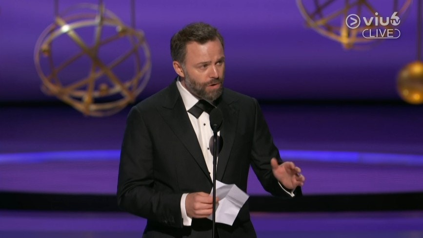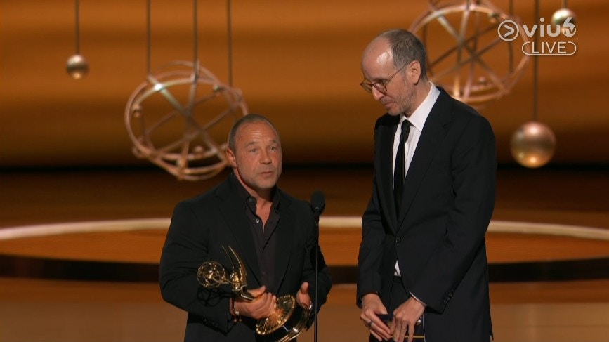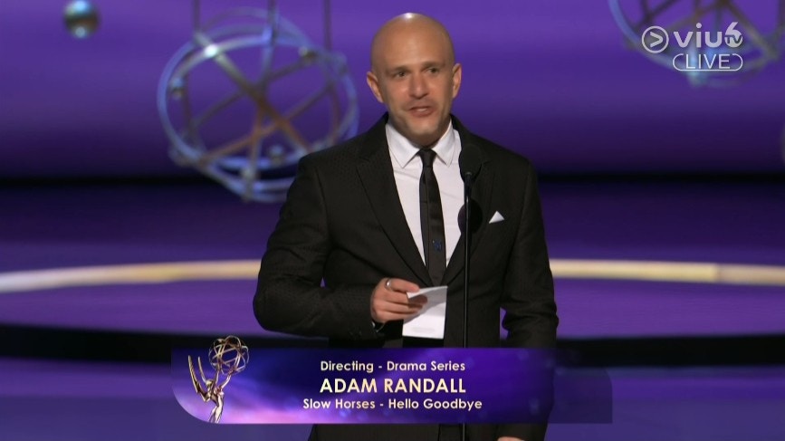 Adam Randall憑劇集《Slow Horses》篇章〈Hello Goodbye〉奪得艾美獎「劇情系列最佳導演獎」。(直播截圖)