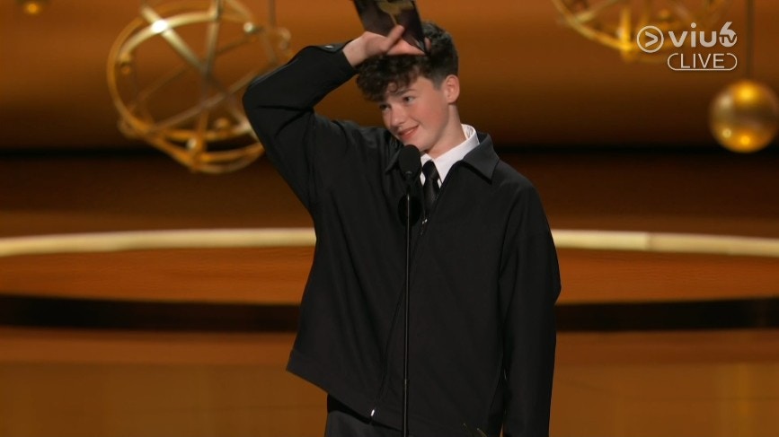 Netflix話題劇集《混沌少年時》少年男主角Owen Cooper奪得艾美獎「迷你劇或選集或電影最佳男配角獎」。(直播截圖)