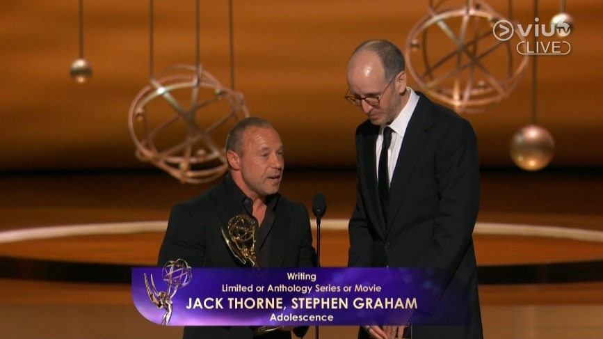 《混沌少年時》編劇兼男主角Stephen Graham與編劇Jack Thorne奪得艾美獎「迷你劇或選集或電影最佳編劇獎」。(直播截圖)
