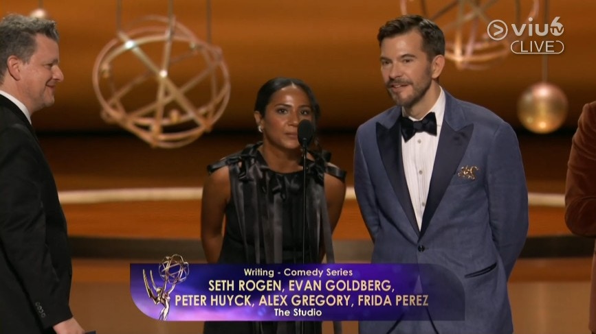 《The Studio》編劇Seth Rogen、Evan Goldberg、Peter Huyck、Alex Gregory及Frida Perez共同奪得艾美獎「喜劇系列最佳編劇獎」。(直播截圖)