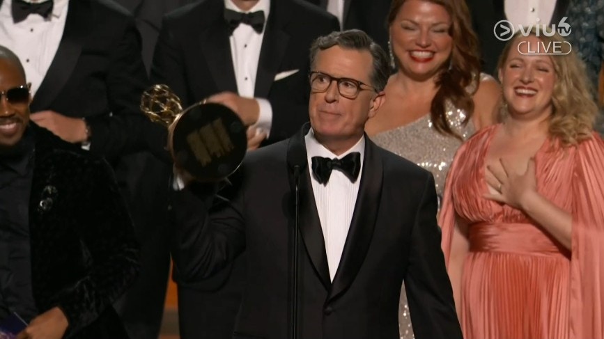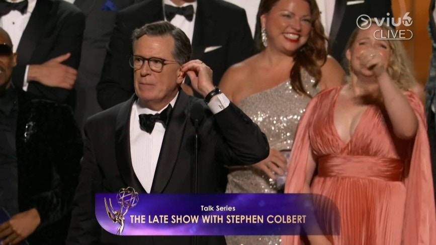 10:39 - 美國名嘴Stephen Colbert憑晚間節目《The Late Show with Stephen Colbert》奪得「最佳訪談節目獎」。