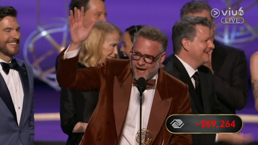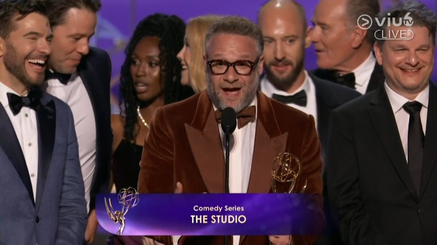 Seth Rogen及其團隊憑電視喜劇《The Studio》奪得艾美獎「最佳喜劇系列獎」。(直播截圖)