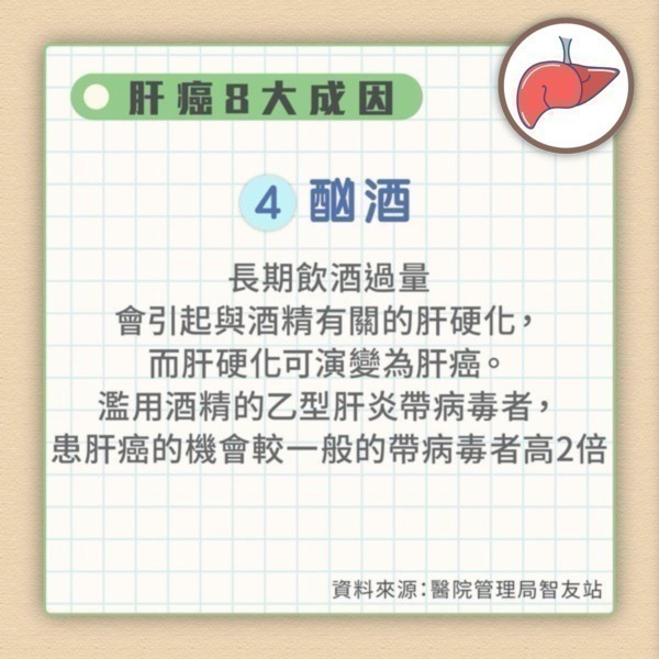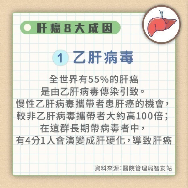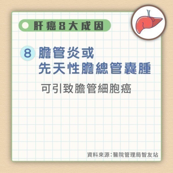 肝癌屬本港第3號癌症殺手,每年新症數目約有1,800宗,有7成半是男性,平均發病年齡為63至69歲,死亡人數逾1,500人,且4成肝癌患者確診時已屬晚期。肝癌主要有8大成因: