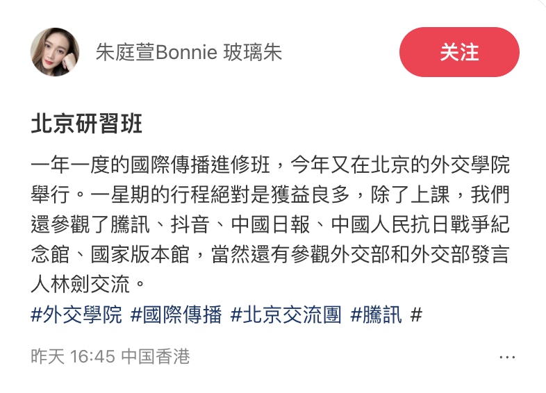朱庭萱發文:「北京研習班 一年一度的國際傳播進修班,今年又在北京的外交學院舉行。一星期的行程絕對是獲益良多,除了上課,我們還參觀了騰訊、抖音、中國日報、中國人民抗日戰爭紀念館、國家版本館,當然還有參觀外交部和外交部發言人林劍交流。 #外交學院 #國際傳播 #北京交流團 #騰訊#」