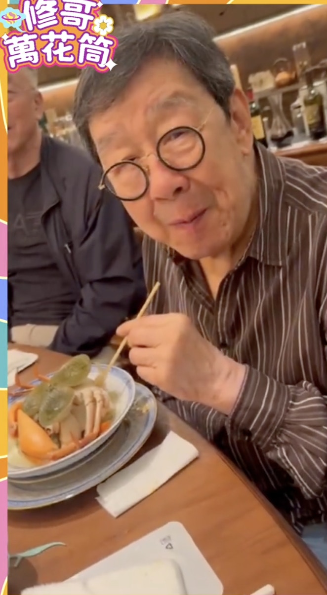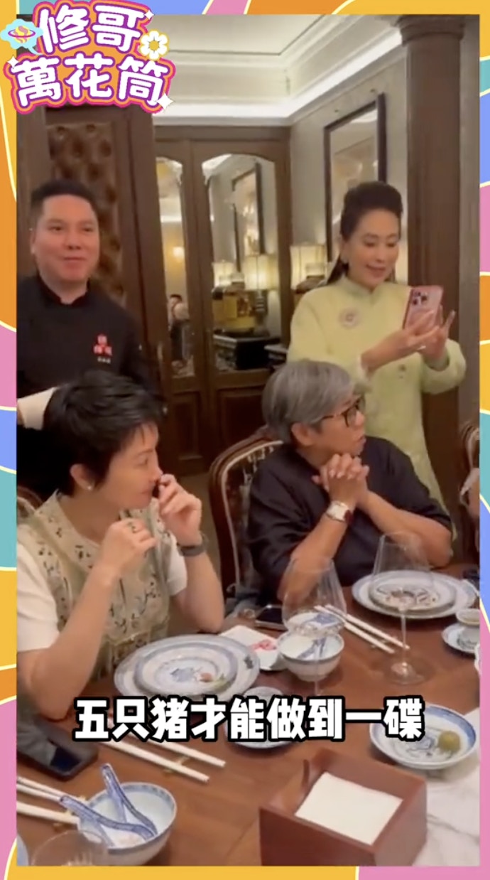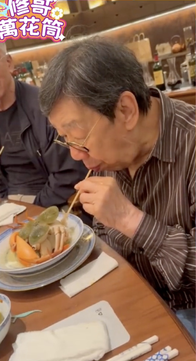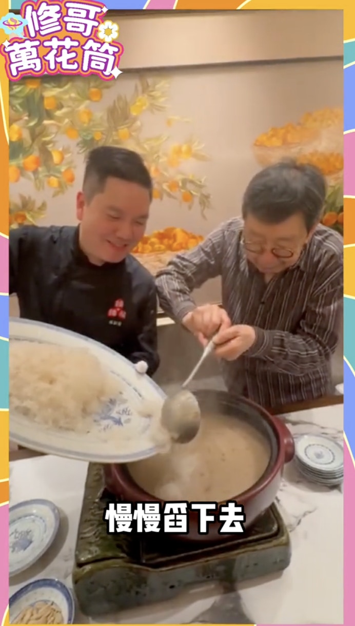修哥上載與朋友北上食陳皮宴的片段,修哥胃口大開啜蟹汁,又親手落手將巨量燕窩倒落粥內,土豪味十足!同場還有肥媽(Maria Cordero)、億萬富婆陳曼娜、90年代「鬼后」王玉環。肥媽在飯桌上傾情演唱蔡琴的《相思河畔》贈修哥,唱完「我要輕輕的告訴你 不要把我忘記」後,修哥搞笑地抱手直言:「好凍呀!」認真玩得!不過有網民認為5萬蚊一餐太貴,「感覺還是有點智商稅」。