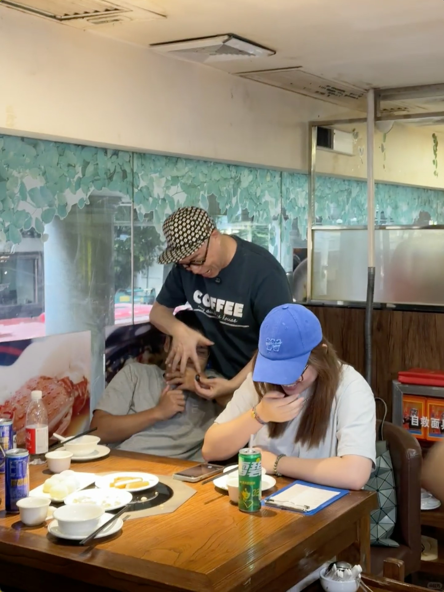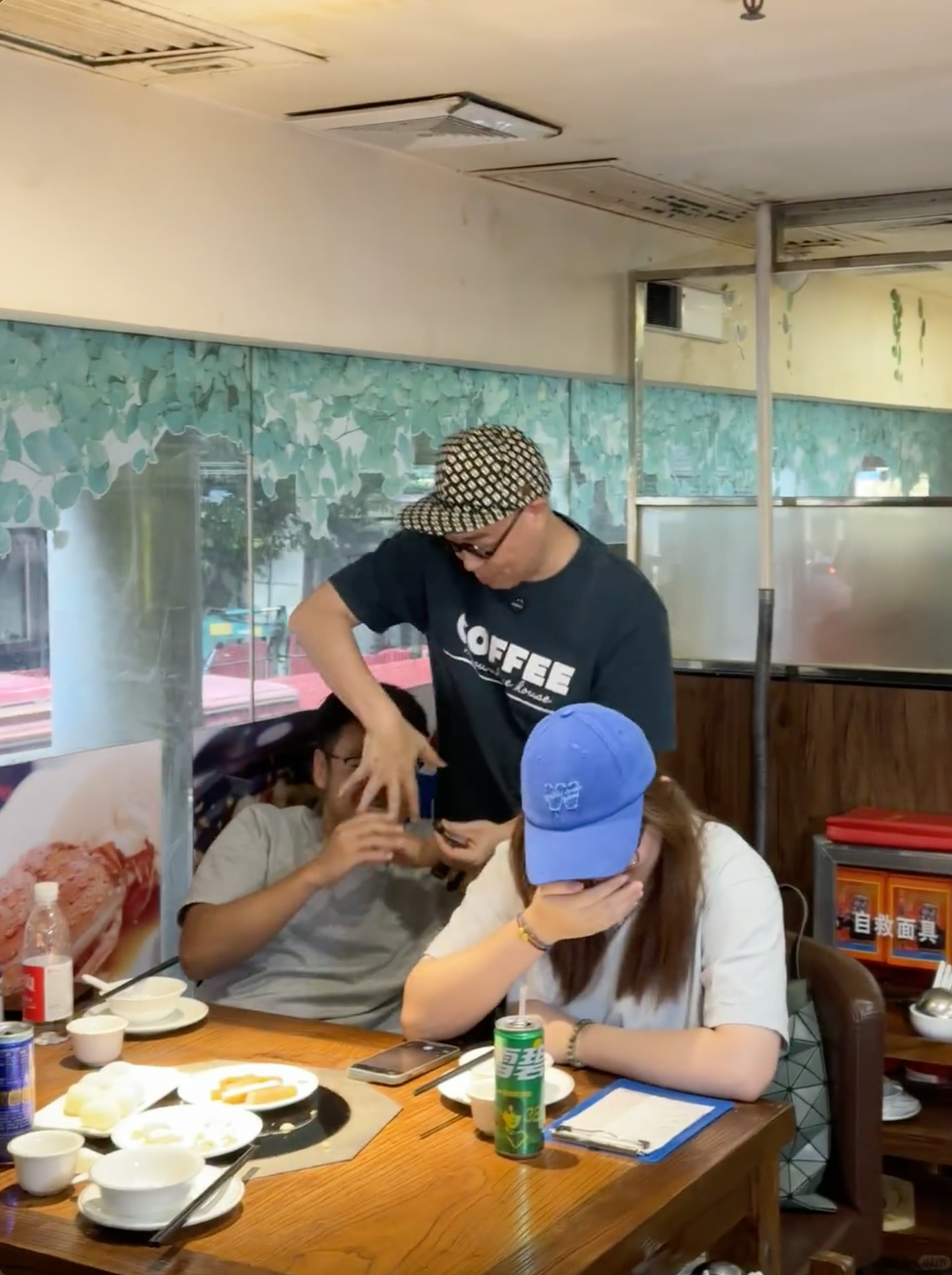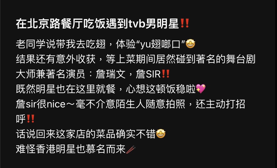 從博主分享的動態相片所見,詹瑞文與工作人員現身廣州一間出名的食肆,他頭戴Cap帽,配上招牌的粗框圓圈眼鏡,身穿一件鮮明的綠色T恤及鬆身的闊腳褲,打扮年輕有活力。博主表示:「詹sir很nice~毫不介意陌生人隨意拍照,還主動打招呼」,片中還見他與食客打成一片,毫無明星架子。