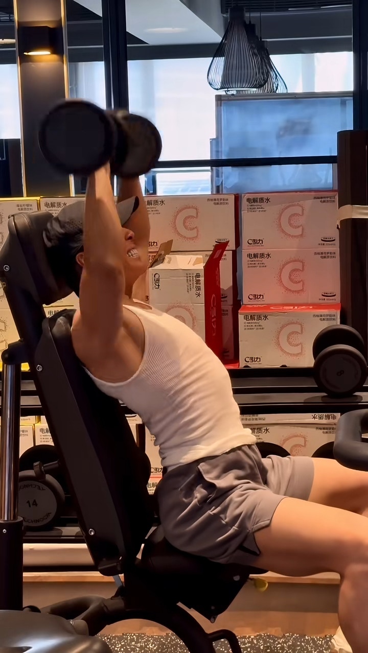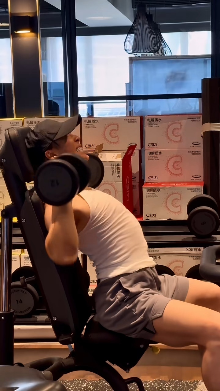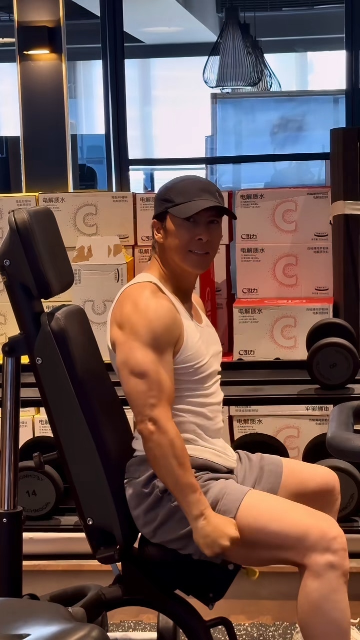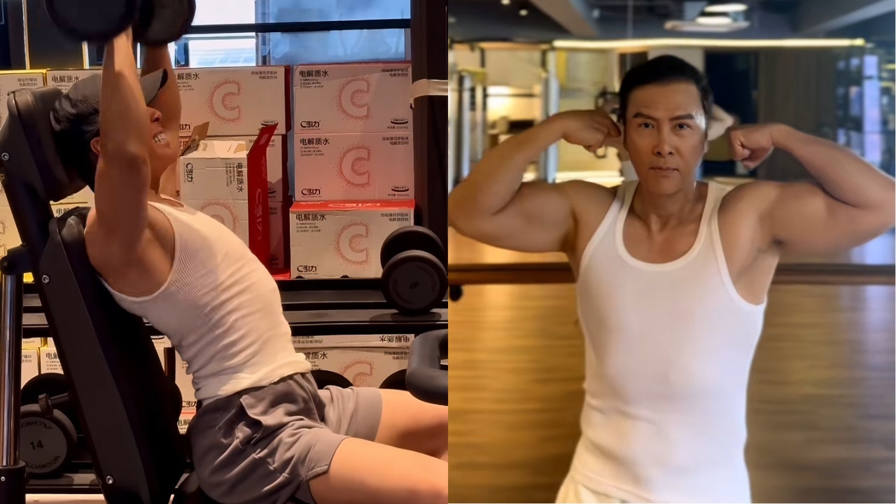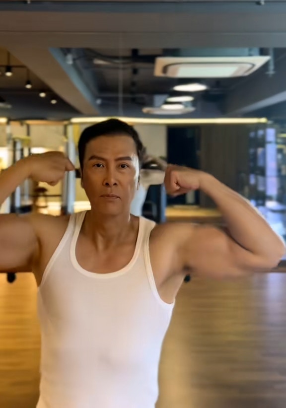 甄子丹現正積極鍛練身體,日前在小紅書分享一段舉啞鈴的影片,渾身肌肉,看到人心心眼!穿上貼身白背心的甄子丹大騷結實手臂,雙手各舉起一個啞鈴,雖然好重,但仍咬緊牙關每一下都伸直雙手。數下次後,甄子丹運勁握緊拳頭,手臂肌肉線條分明,目測二頭肌比頭更大,十足誇張。而另一段影片,就見甄子丹倒三角的完美身型,在鏡頭前「彈吓彈吓」,完全看不出真實年齡已過60歲。