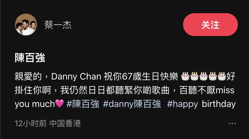 蔡一傑在社交平台分享自己與陳百強的合照,相中兩人年輕又帥氣,他寫道:「陳百強 親愛的,Danny Chan 祝你67歲生日快樂 🎂🎂🎂好掛住你啊,我仍然日日都聽緊你啲歌曲,百聽不厭miss you much🩷」