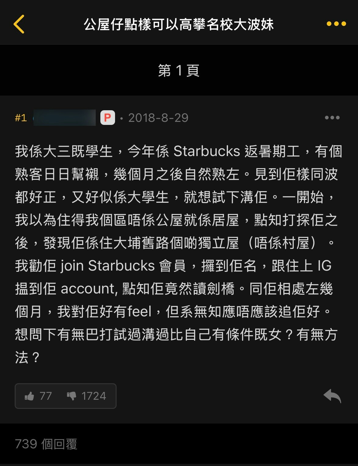 網民透露自己在咖啡店返暑期工,有位樣靚身材正的大學生日日都來買咖啡,便對她心動,「一開始,我以為住得我個區唔係公屋就係居屋,點知打探佢之後,發現佢係住大埔舊路個啲獨立屋(唔係村屋)。」樓主勸對方加入咖啡店會員,取得對方名字後就找到其IG,發現女方居然讀劍橋,深感學歷和家底都懸殊的他,就希望網民能獻計教他追女仔。