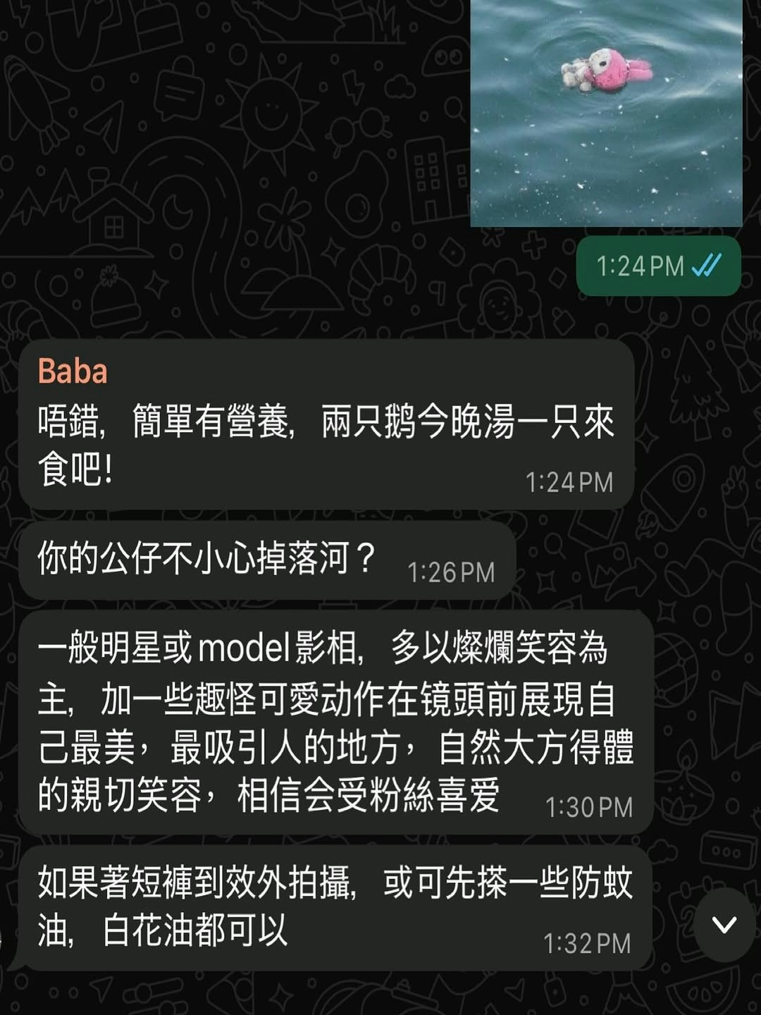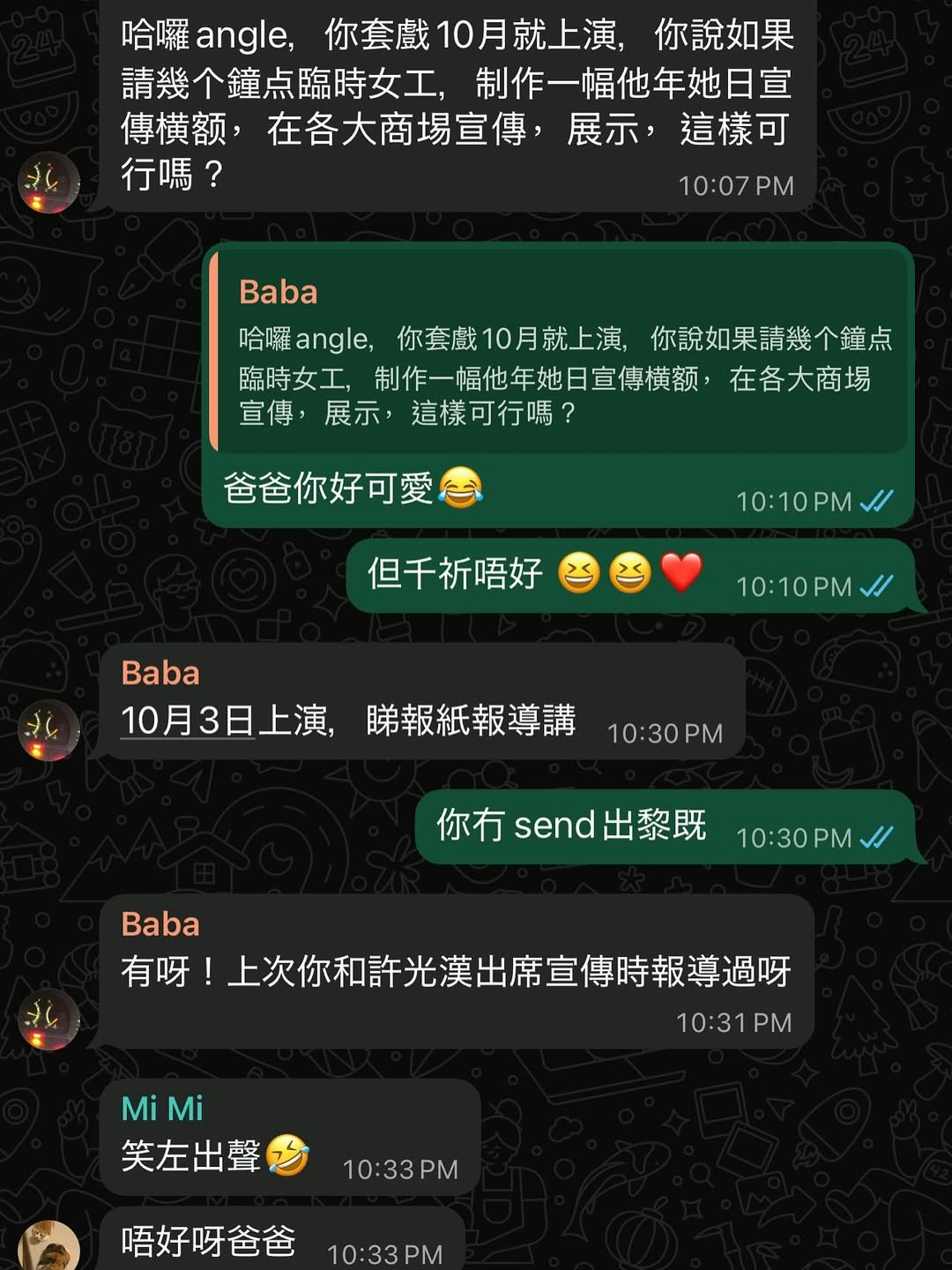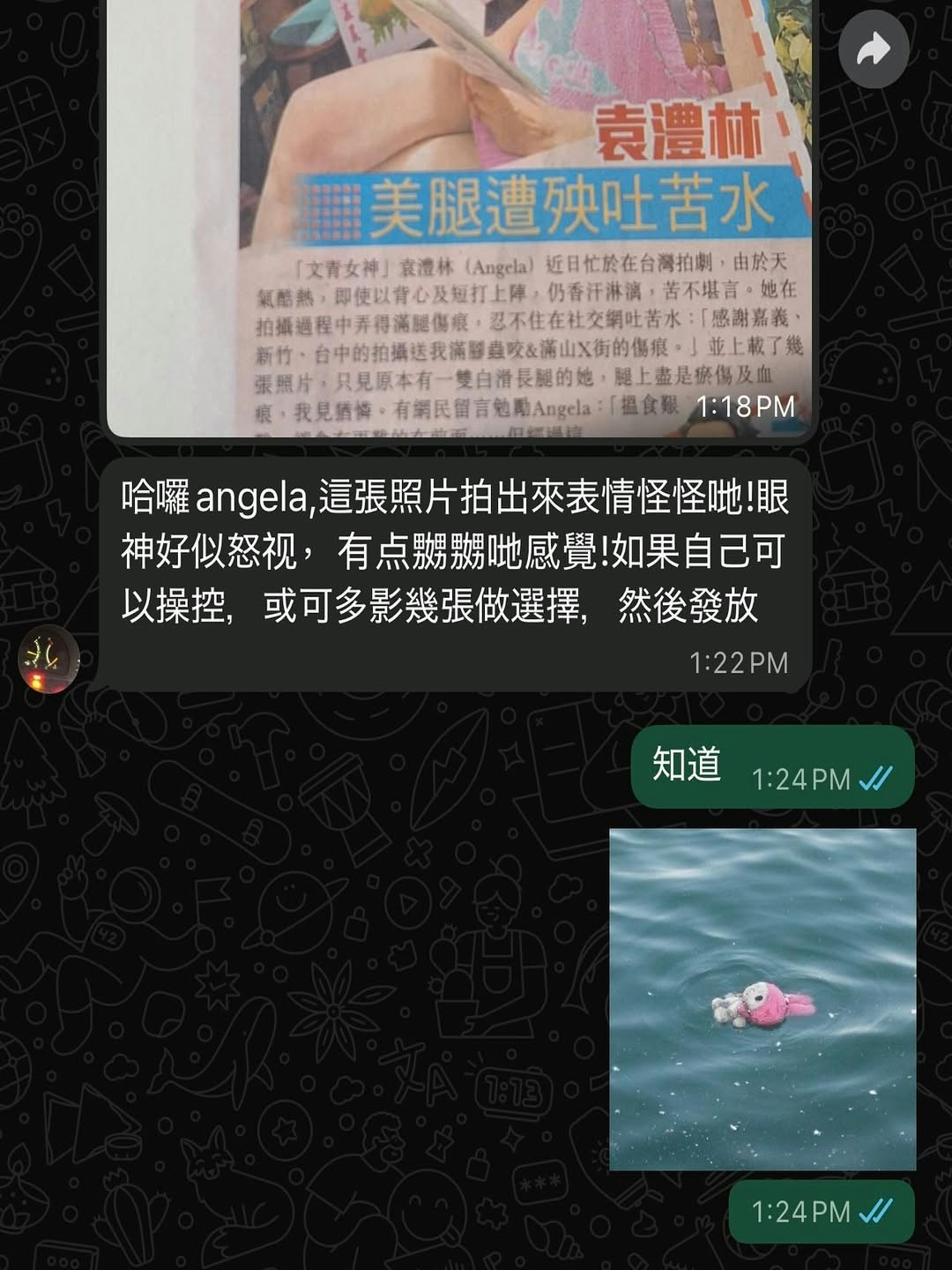 袁爸爸作為「前世情人」,更非常關心媒體報道女兒的動態,更會極具儀式感地儲起相當報道的剪報。其中,當袁爸爸留意到Angela見報的一張相片似乎「嬲爆爆」,便傳訊息勸說:「眼神好似怒視,有點嬲嬲哋感覺!如果自己可以操控,或可多影幾張做選擇,然後發放。」非常關心女兒公眾形象之餘,亦尊重Angela身處於娛圈多年的判斷能力。然而當Angela回覆並傳送一張表達心情的Sticker時,袁爸爸隨即天真地回覆:「你的公仔不小心掉落河?」反應非常認真可愛!