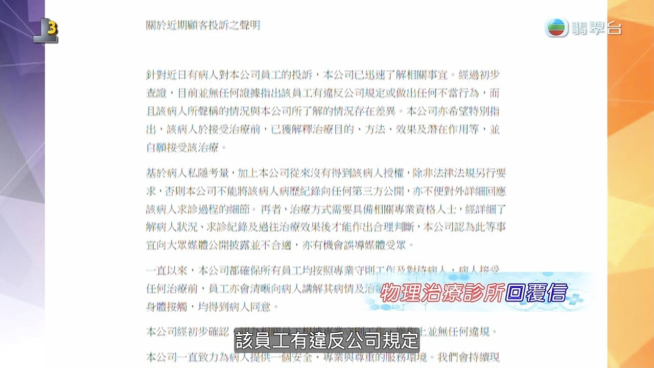 沈小姐也透露,有關治療師亦曾在她的肝附近用力按壓,令肋骨位置出現瘀傷,又曾要求她拉高衣服到胸部以下位置,在附近按壓。沈小姐明言:「我起碼要畀佢知道我會保護自己,唔知你想點。佢不斷按,按咗好耐,