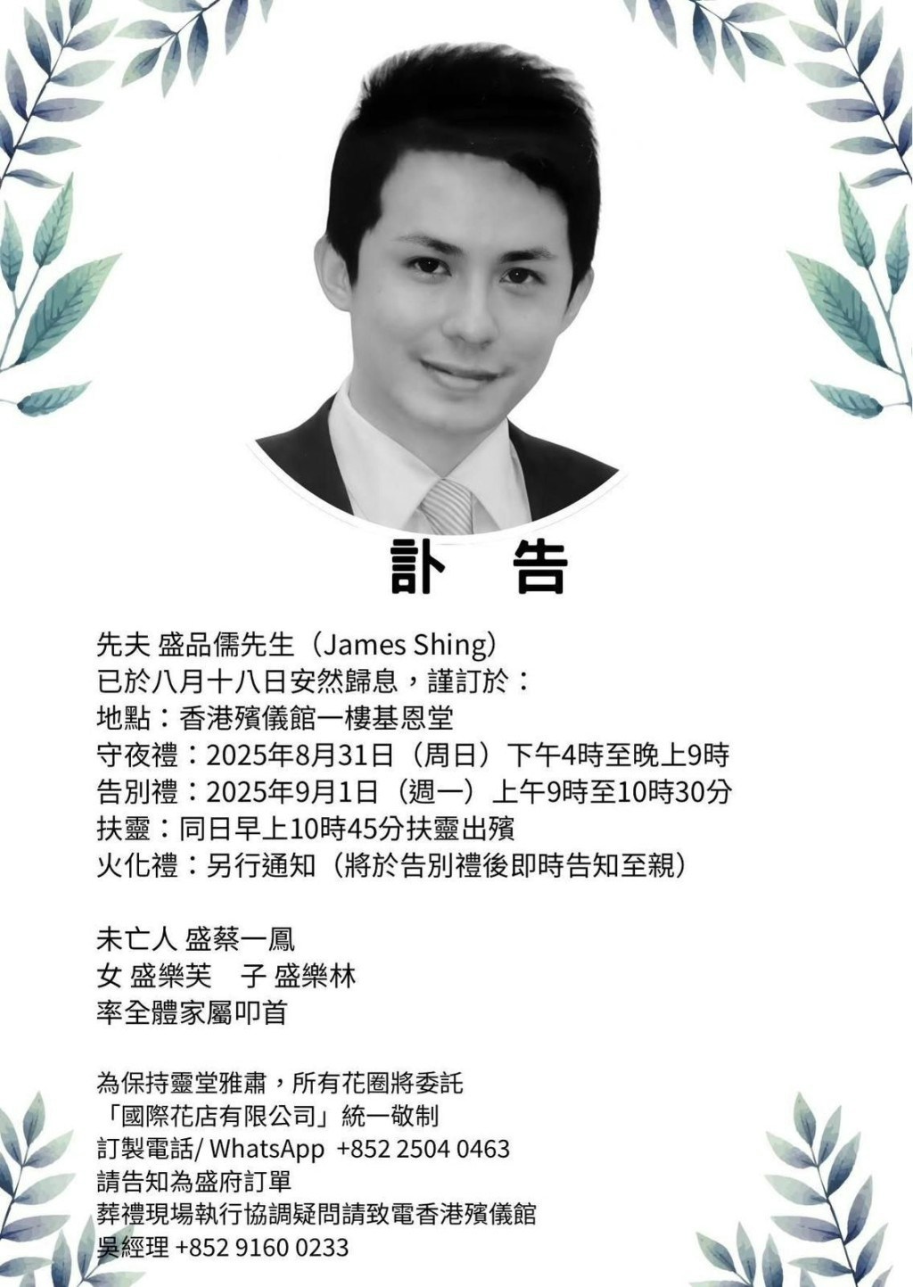 前亞視高層盛品儒(James)於今年8月18日病逝,終年48歲,遺下太太蔡一鳳(Michelle)及一對年幼子女。昨晚(2日)蔡一鳳在社交平台以「傳統 ...