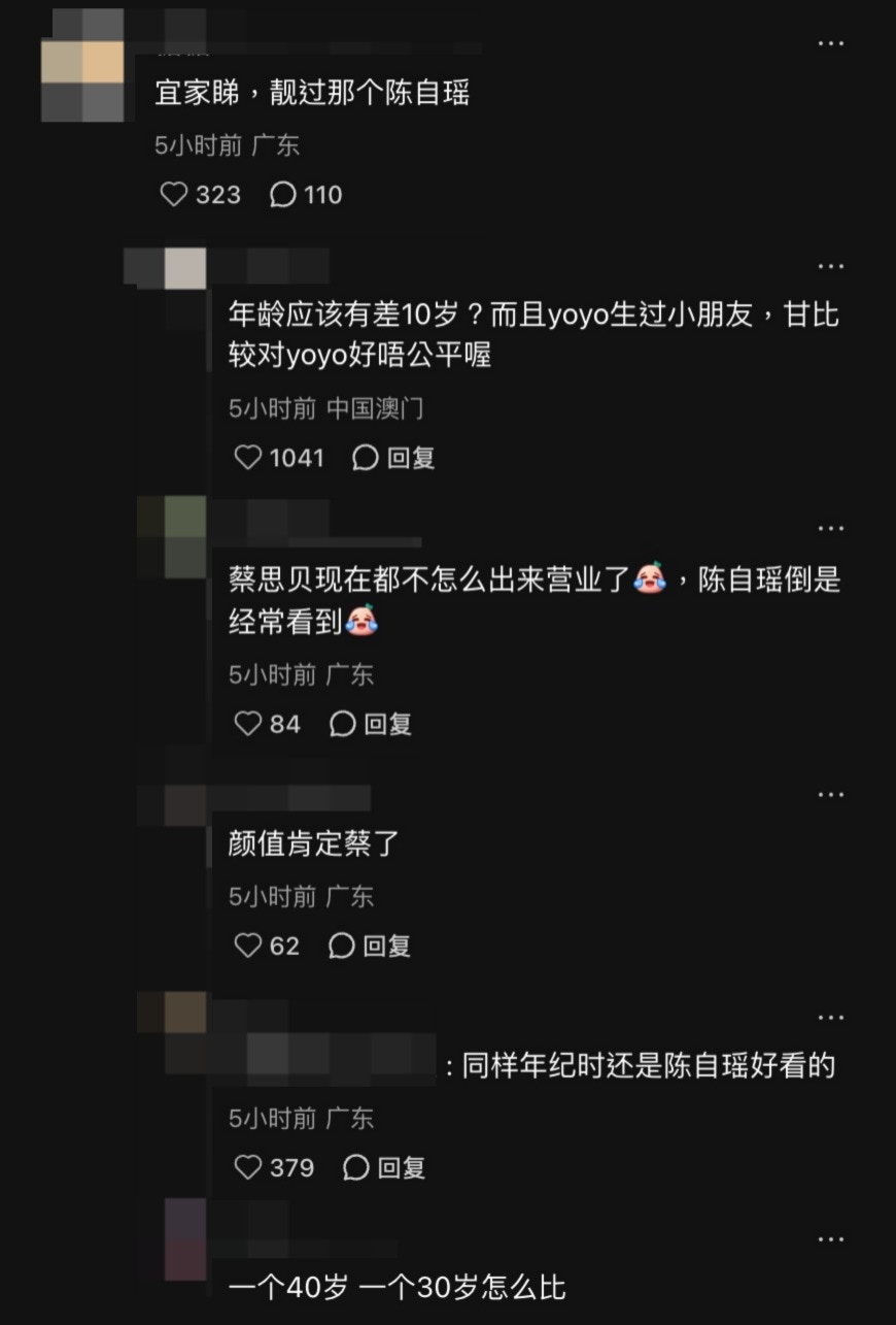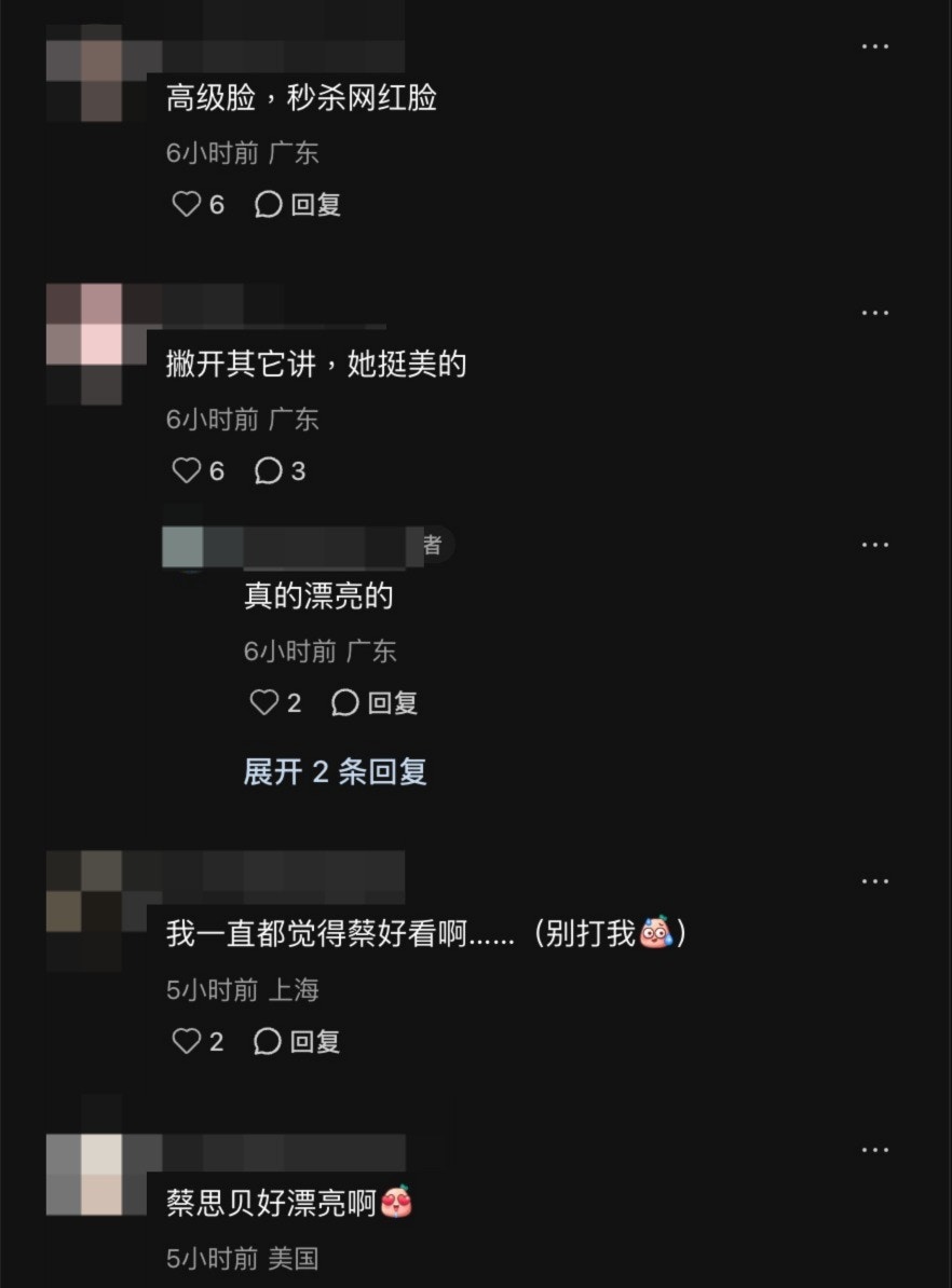 有趣的是,早前曾有大批網民湧入TVB高層樂易玲的小紅書,留言要求「別找蔡思貝演戲」,短短數小時有超過6,000人讚好,群情洶湧。但經過近期的沉澱,許多網民對她大為改觀,留言區由以往的謾罵攻擊,變成不少讚美:「高級臉」、「越來越美」、「確實很漂亮」、「不管了,反正我是顏狗,她真的好漂亮啊」,甚至有網民將她與昔日緋聞對象的太太陳自瑤比較,「宜家睇,靚過那個陳自瑤」、「靚過多多聲就算yoyo後生10年都比不過啦」,似乎成功挽回不少民心;不過,也有網友為陳自瑤抱不平,指出兩人年齡相差十歲,且陳自瑤已為人母,直接比較不公平,大讚陳自瑤年輕時也樣貌甜美,現在就更添一份女人味。