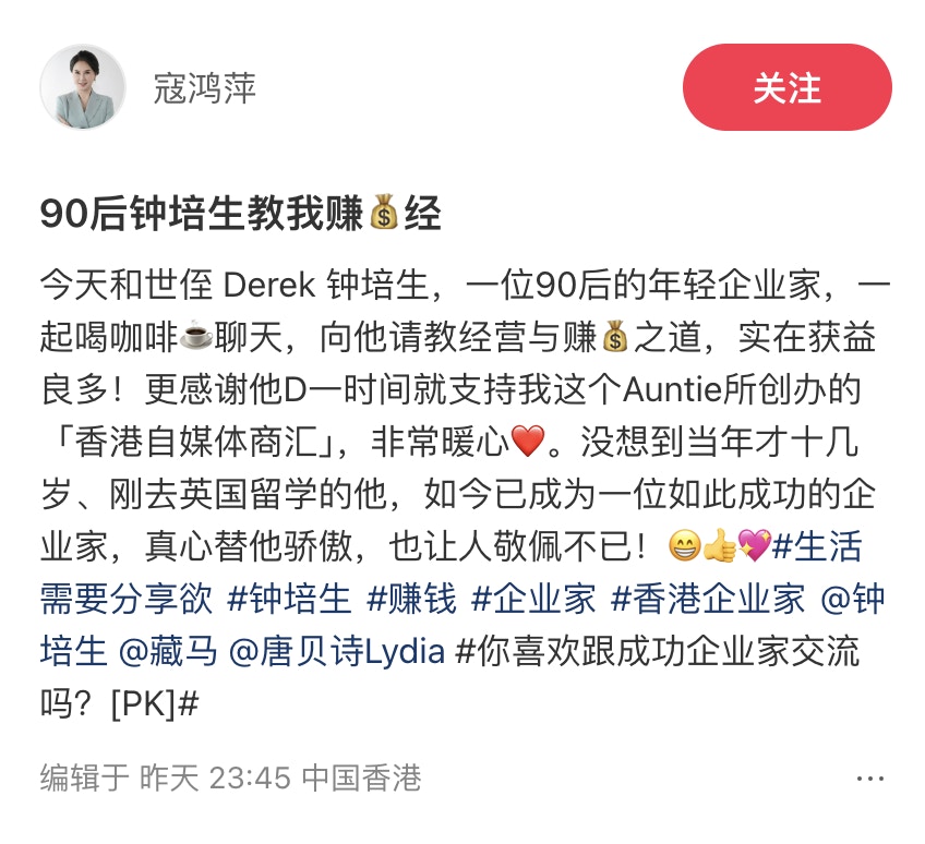 寇鴻萍近日上載與鍾培生(Derek)聚會的照片,兩人一齊飲咖啡。鍾培生與寇鴻萍、唐貝詩並排坐合照,寇鴻萍謙虛地指向他請教賺錢經,又揭鍾培生會支持寇鴻萍事業,寇鴻萍大讚鍾培生為「成功企業家」,她發文道:「90後鐘培生教我賺錢經 今天和世侄 Derek 鍾培生,一位90後的年輕企業家,一起喝咖啡聊天,向他請教經營與賺錢之道,實在獲益良多!更感謝他D一時間就支持我這個Auntie所創辦的『香港自媒體商匯』,非常暖心。沒想到當年才十幾歲、剛去英國留學的他,如今已成為一位如此成功的企業家,真心替他驕傲,也讓人敬佩不已!」