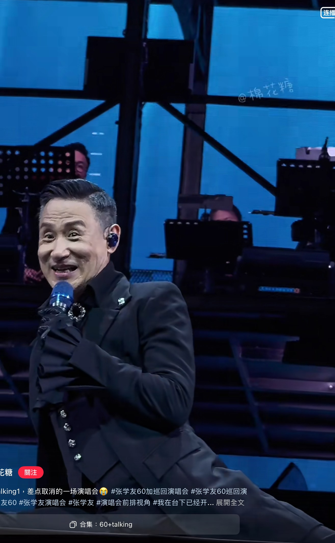 張學友演唱會尾場唱到一半時,突然表示演唱會或要中止:「開始嘅時候都已經好難控制到我把聲,大家知我做咗40年啦係咪?今年踏入我41年,要我做一個我自己冇辦法可以……我唔好話100%,或者掌握到我自己表演嘅一個演唱會,我自己係冇辦法可以過到自己嗰關嘅。」(小紅書@棉花糖)