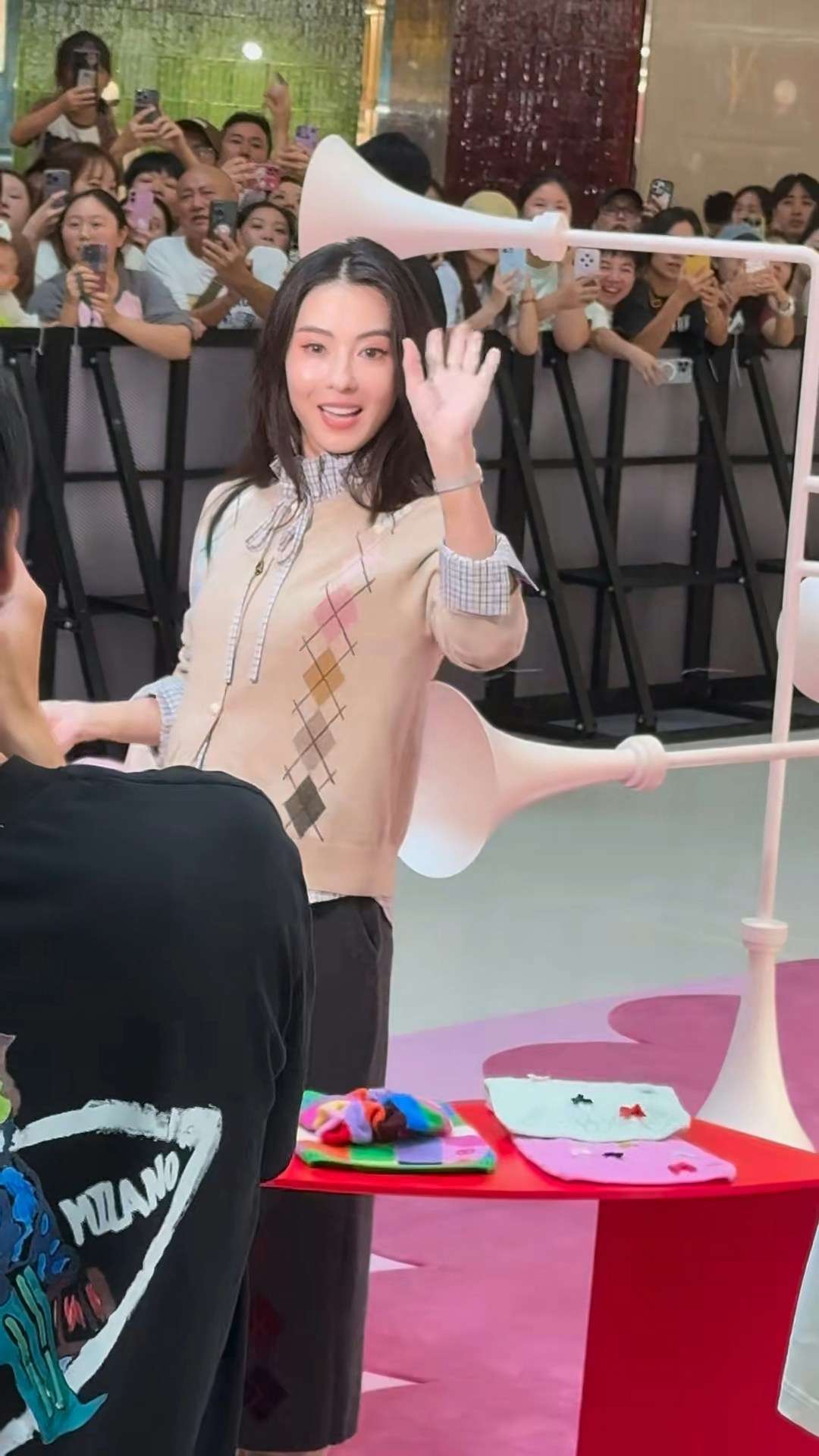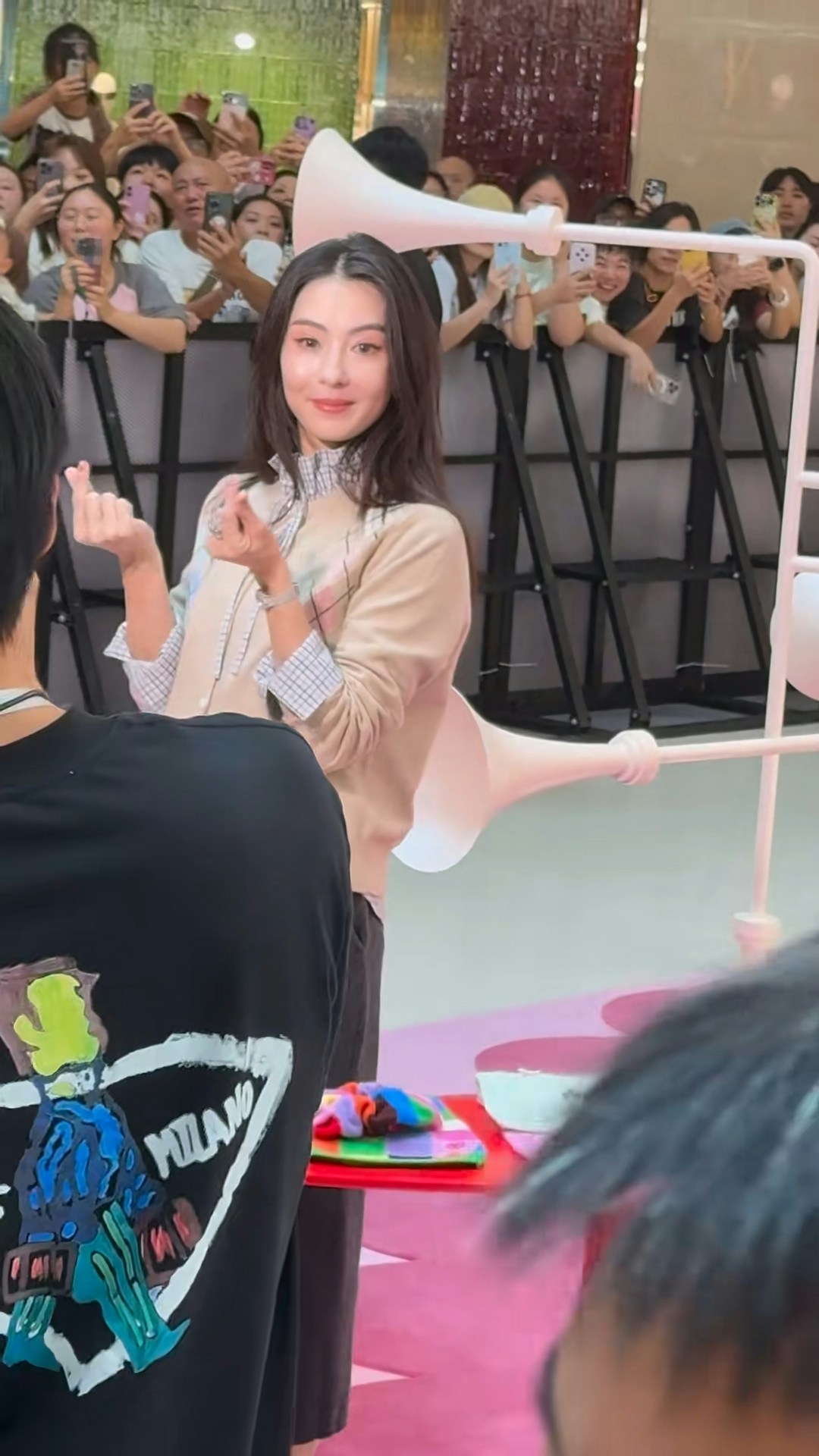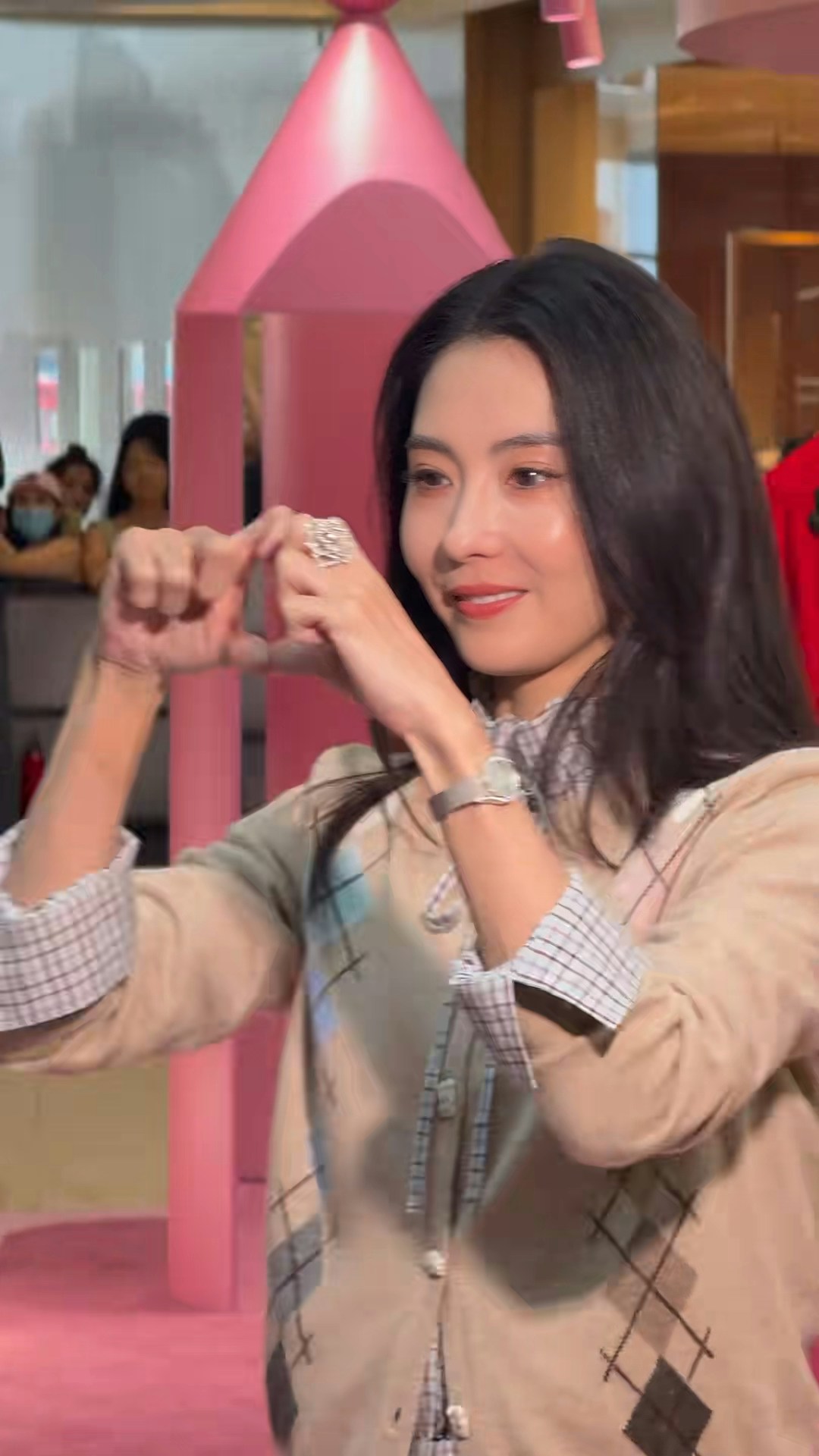 張栢芝近年再次活躍於幕前,除了亮相內地綜藝節目,早前擔任林家謙演唱會嘉賓,一開金口更令全場觀眾進入瘋狂狀態。日前,張栢芝現身內地一個品牌活動,吸引大批市民圍觀,場面墟冚。而張栢芝亦沒有令大家失望,身穿高領格仔恤衫外襯冷衫,披着一把烏黑的中分長髮,顏值爆燈。心情大靚的她,全程笑容滿臉,更向在場圍觀的粉絲們大派心心,非常親民。
