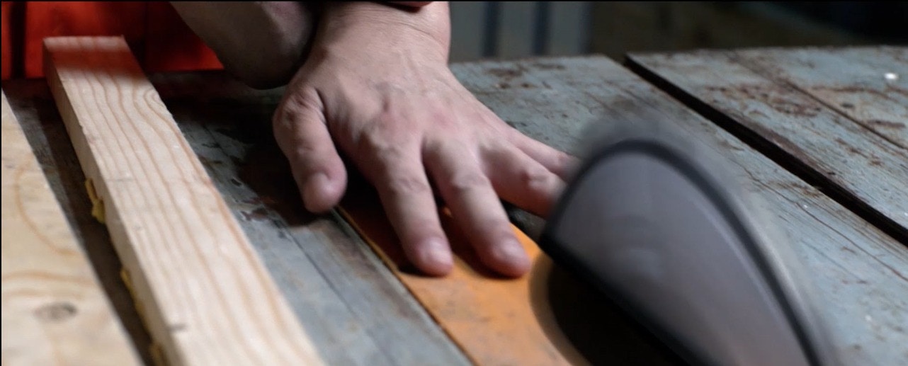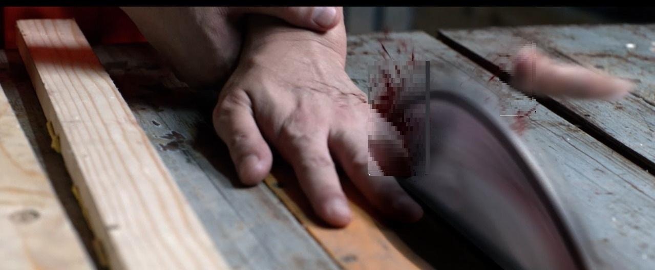將雙指送上電鋸上。(《阿龍》影片截圖)
