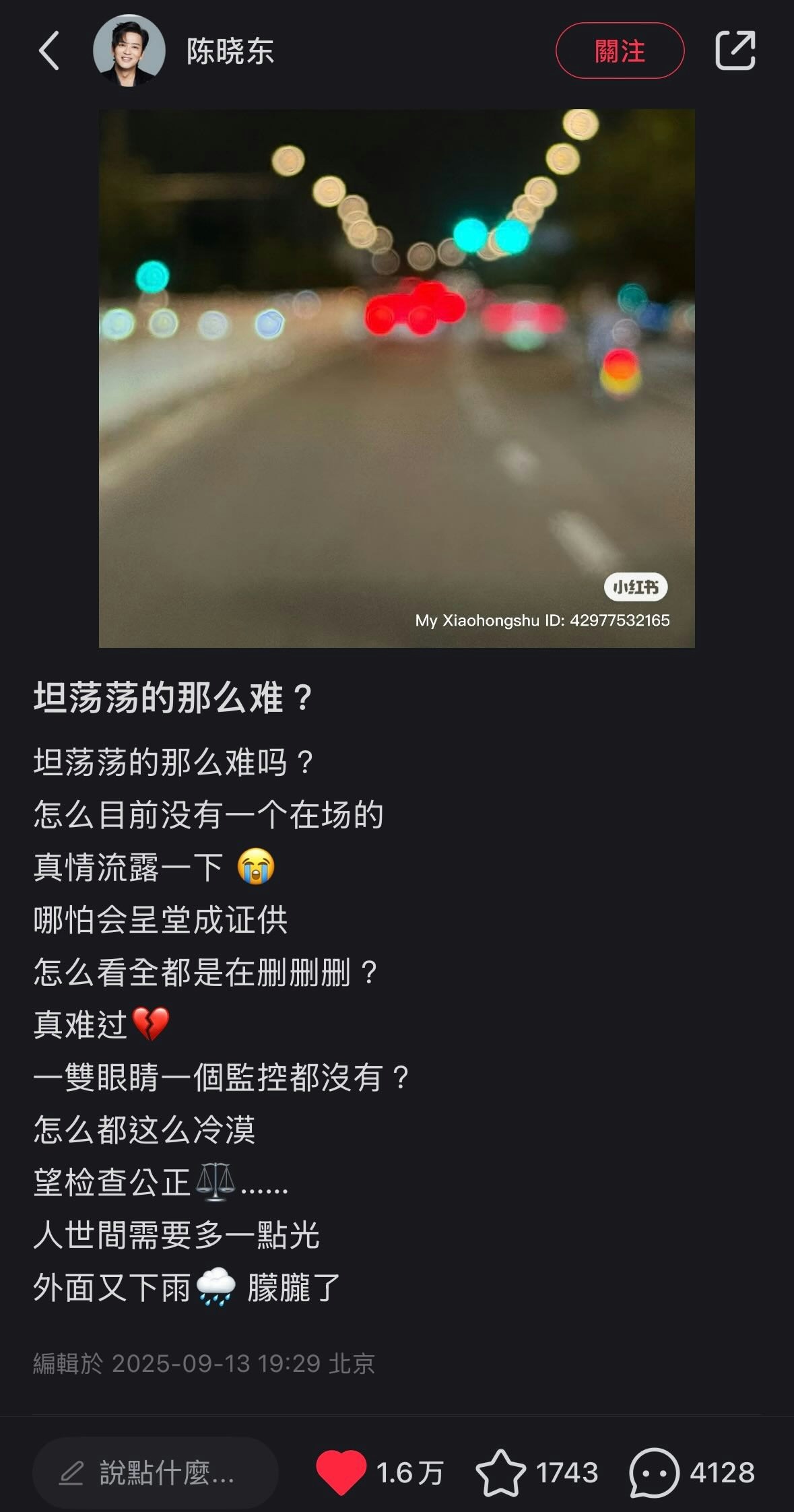 而陳曉東昨晚(13日)亦在小紅書發文,疑為于朦朧發聲,他上載一張朦朧的馬路夜景照,以「坦蕩蕩的那麼難?」為題發表感受。陳曉東問:「坦蕩蕩的那麼難嗎?怎麼目前沒有一個在場的,真情流露一下😭 哪怕會呈堂成證供,怎麼看全都是在刪刪刪?真難過!一雙眼睛一個監控都沒有?怎麼都這麼冷漠,望檢查公正⚖️……人世間需要多一點光,外面又下雨🌧️朦朧了」。