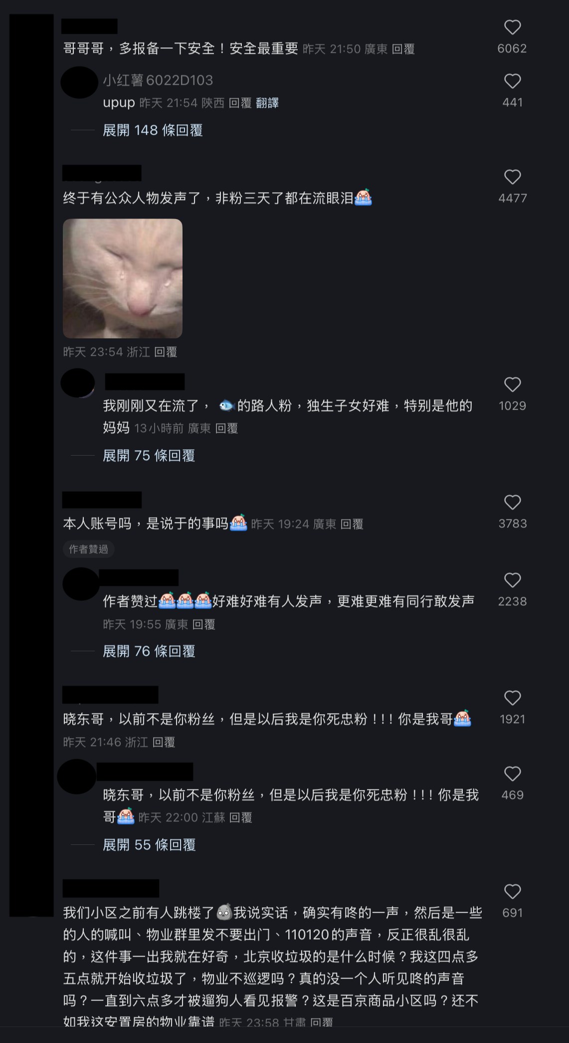 不少網民都感謝陳曉東:「求真相求正義」、「謝謝哥哥為朦朧勇敢發聲!也請你保護好自己!」、「從昨天到現在發的帖文全被刪和限流,但是也保護好自己」、「終於有圈內人發聲了,太好了,希望更多知道事情真相的人可以站出來」等,而帖文也傳到香港網民,有人出帖表示:「天啊!陳曉東好勇敢!」、「他的死絕不單純,不查清楚他不會是最後一位,一定會有下一位,明明號稱有全世界最多監視器的國家,發生事情時,卻什麼影片都找不到🙄」、「他真的很好,他之前也直接在Threads回覆汪小菲這個人….我覺得他好勇敢,我年輕時沒有愛錯人!」、「陳曉東這麼好的嗎 😢好加分」不過也有人擔心陳曉東安危,勸他刪文,提醒他要報平安。