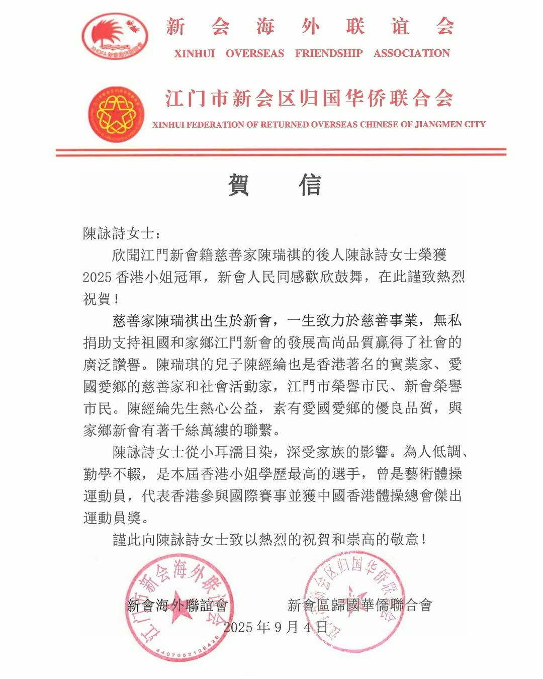 陳詠詩激動寫道:「收到來自家鄉江門新會嘅賀信,令我心裏面好感動同溫暖。感謝家鄉長輩同鄉親特登為我寫低祝福,呢份支持對我嚟講特別珍貴,呢份榮耀屬於每一個江門新會人!」