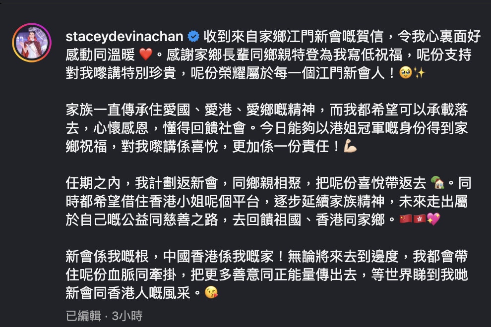 帖文中,陳詠詩也表達了對家鄉的深厚情感,並強調家族精神的傳承,「家族一直傳承住愛國、愛港、愛鄉嘅精神,而我都希望可以承載落去,心懷感恩,懂得回饋社會。今日能夠以港姐冠軍嘅身份得到家鄉祝福,對我嚟講係喜悅,更加係一份責任!」