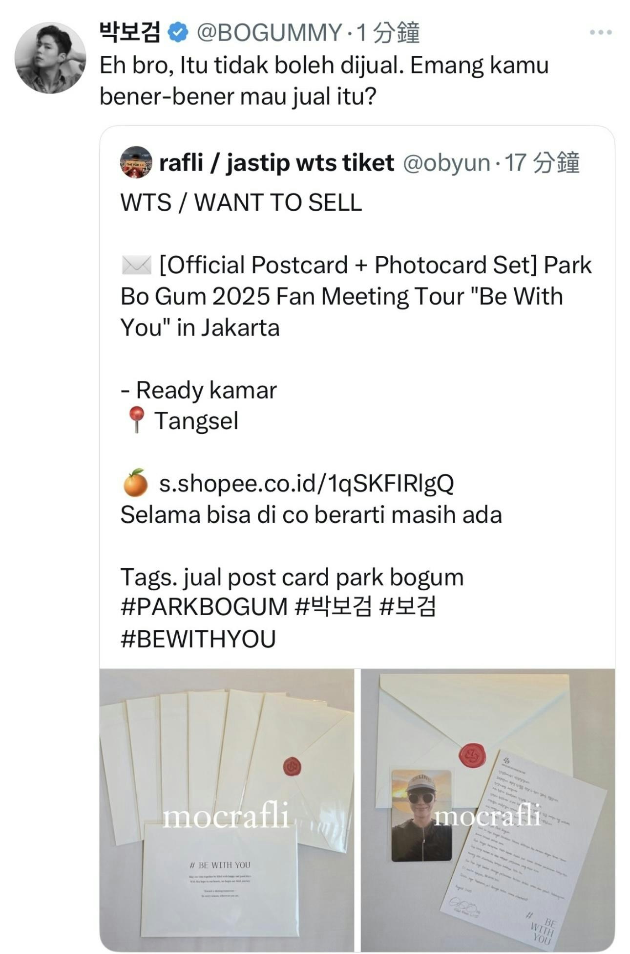 朴寶劍近日正舉行巡迴見面會,造就了不少黃牛賺錢的機會。有黃牛在X上兜售印尼場的禮品,朴寶劍直接轉發黃牛帖文,並寫下「Eh bro, Itu tidak boleh dijual. Emang kamu bener-bener mau jual itu?(兄弟,那個不能賣,你真的要賣嗎?)」,之後又再轉發賣黃牛飛的帖文,其中3人已刪文。