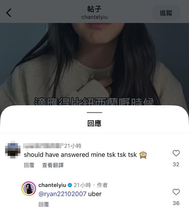 Chantel抵達美國後,不時更新社交網保持人氣,日前拍片回覆粉絲留言時,驚覺星二代留言互動,正是同樣到美國留學,更是紐約大學藝術學院(NYU Tisch)同校校友的李克勤盧淑儀長子李立仁(Ryan)。Chantel主修 Music Business而李立仁則修讀電影電視學系。